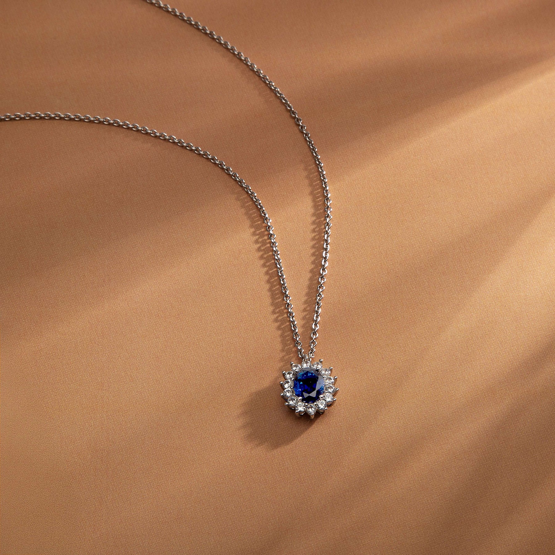 Придайте кралска елегантност на своята визия с това изящно сребърно колие със син циркон. Централният овален камък в дълбоко син цвят е обграден от бляскави бели циркони, които създават изключителен контраст и придават неповторим блясък.