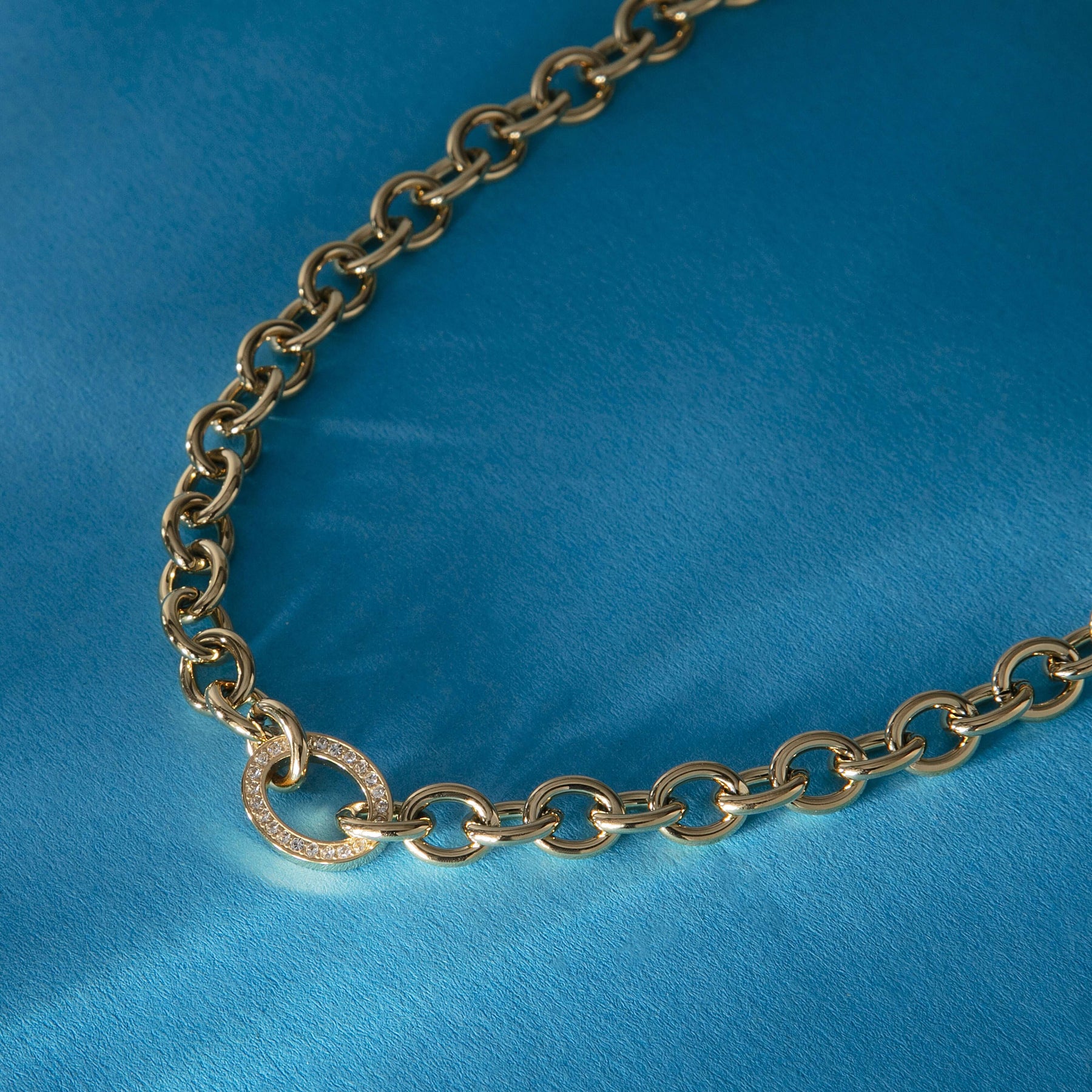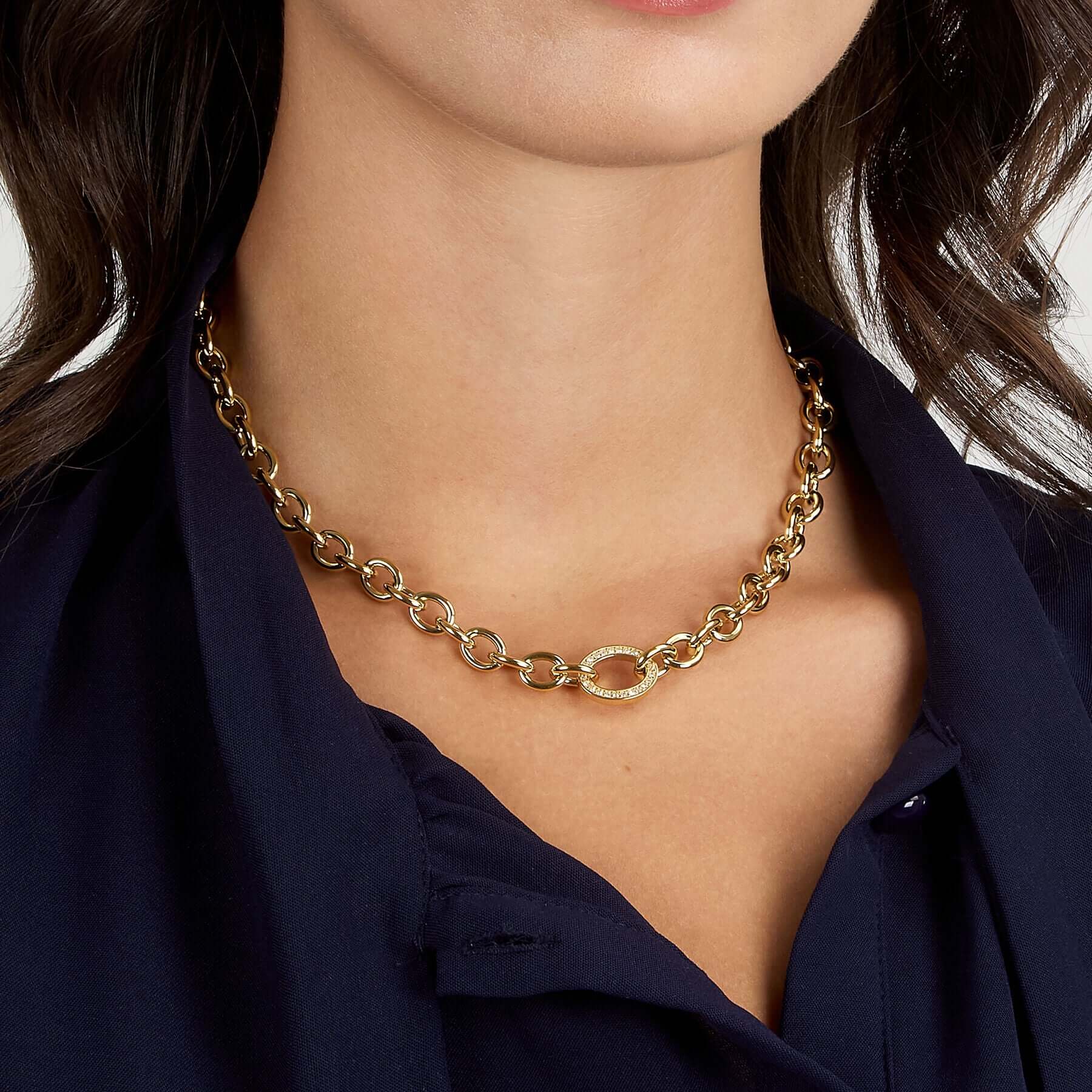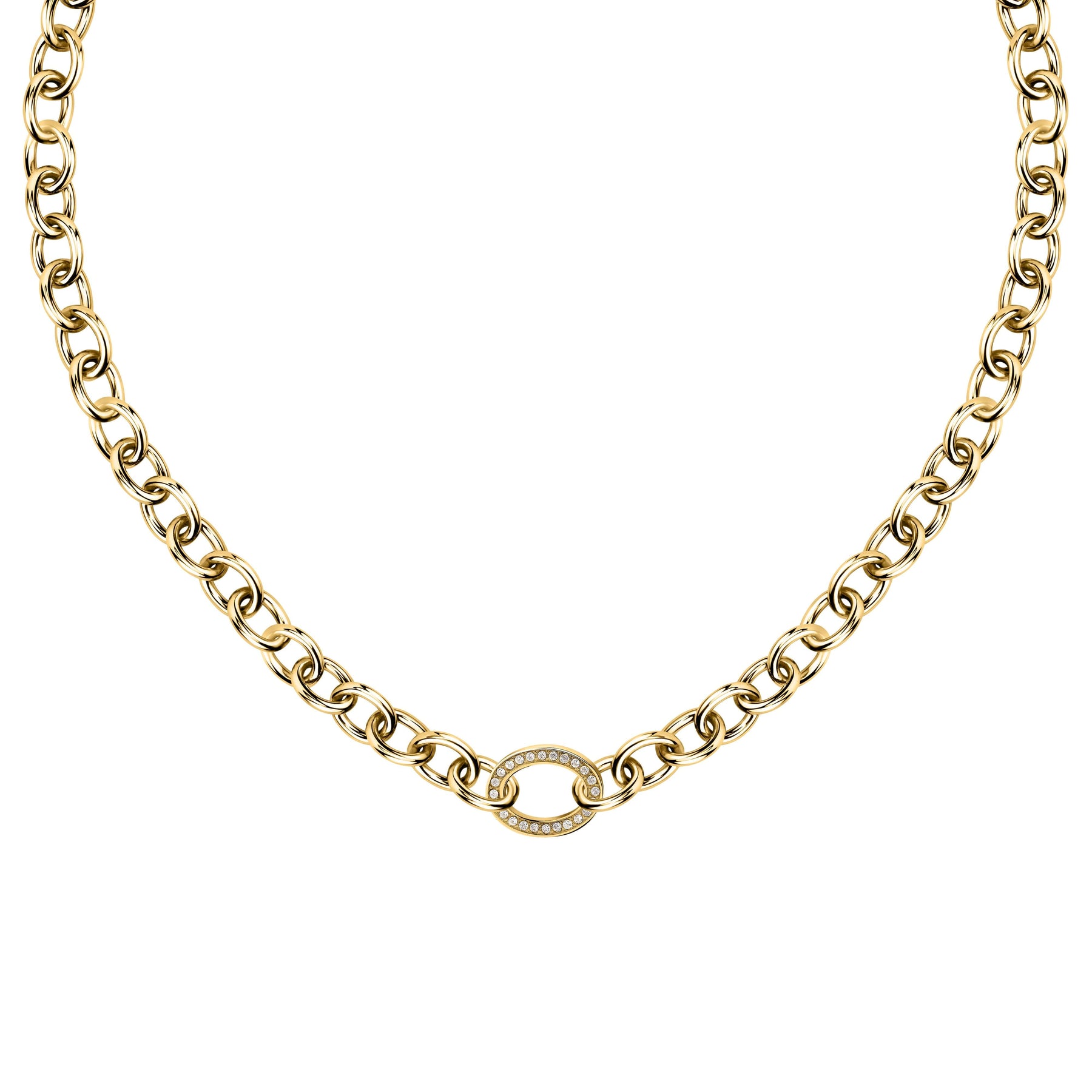 Елегантно колие от стомана със златно PVD покритие, излъчващо стил и класа. Верижката е с масивни звена, завършваща с декоративен елемент във формата на овал, инкрустиран с фини циркони. Подходящо е както за ежедневието, така и за специални поводи, комбинирайки модерна визия с издръжливост.