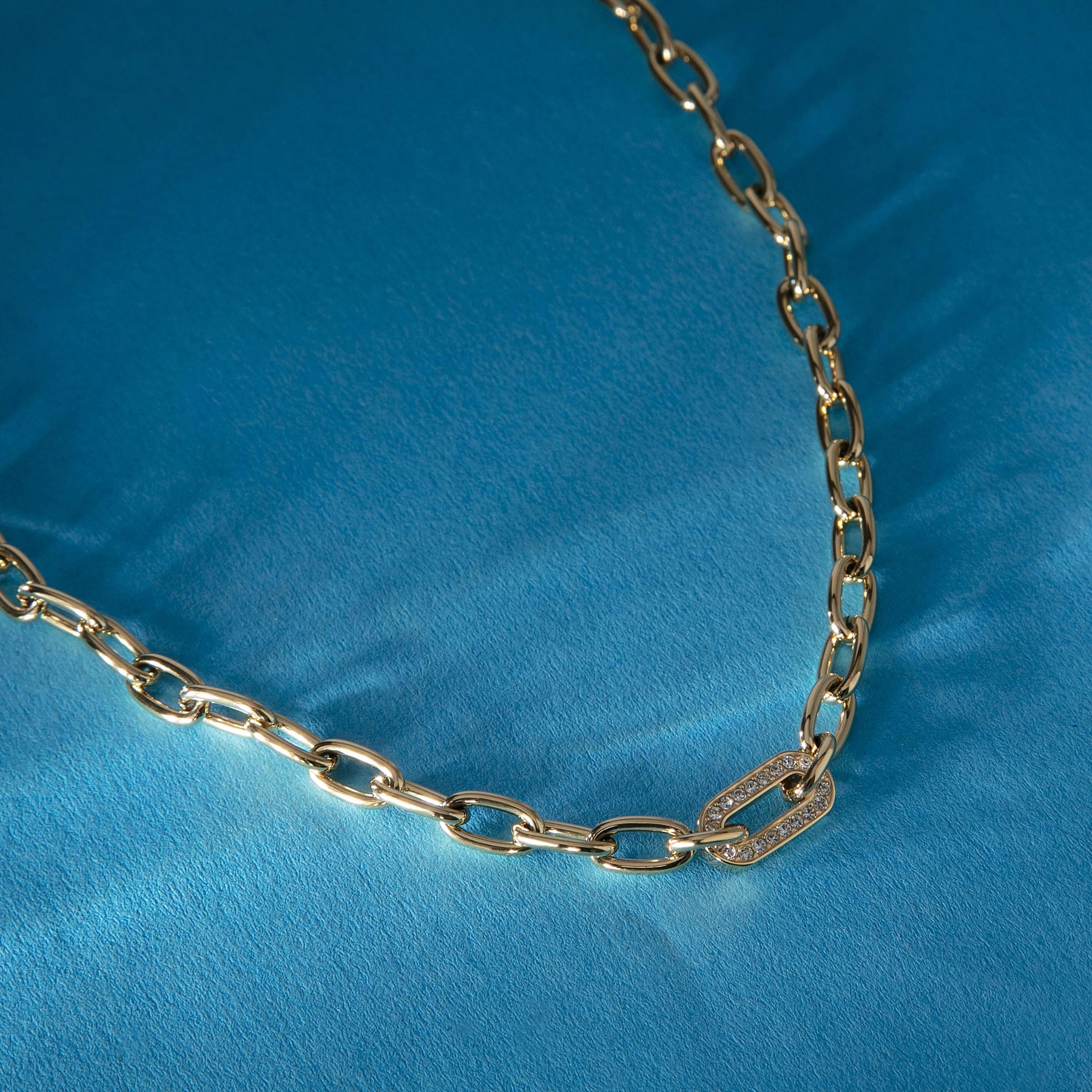 Елегантно колие от стомана със златно PVD покритие, излъчващо стил и класа. Верижката е с масивни звена, завършваща с декоративен елемент във формата на овал, инкрустиран с фини циркони. Подходящо е както за ежедневието, така и за специални поводи, комбинирайки модерна визия с издръжливост.