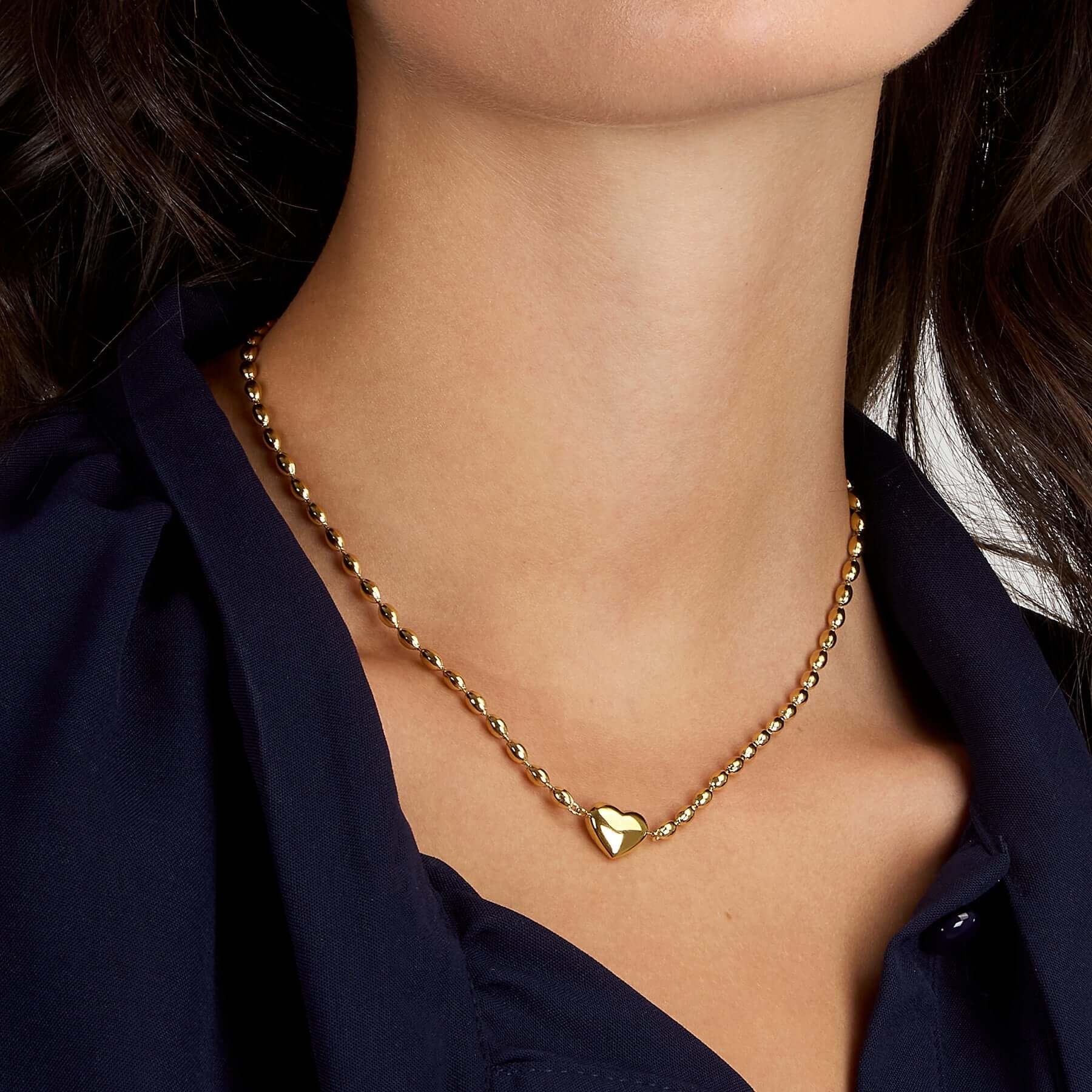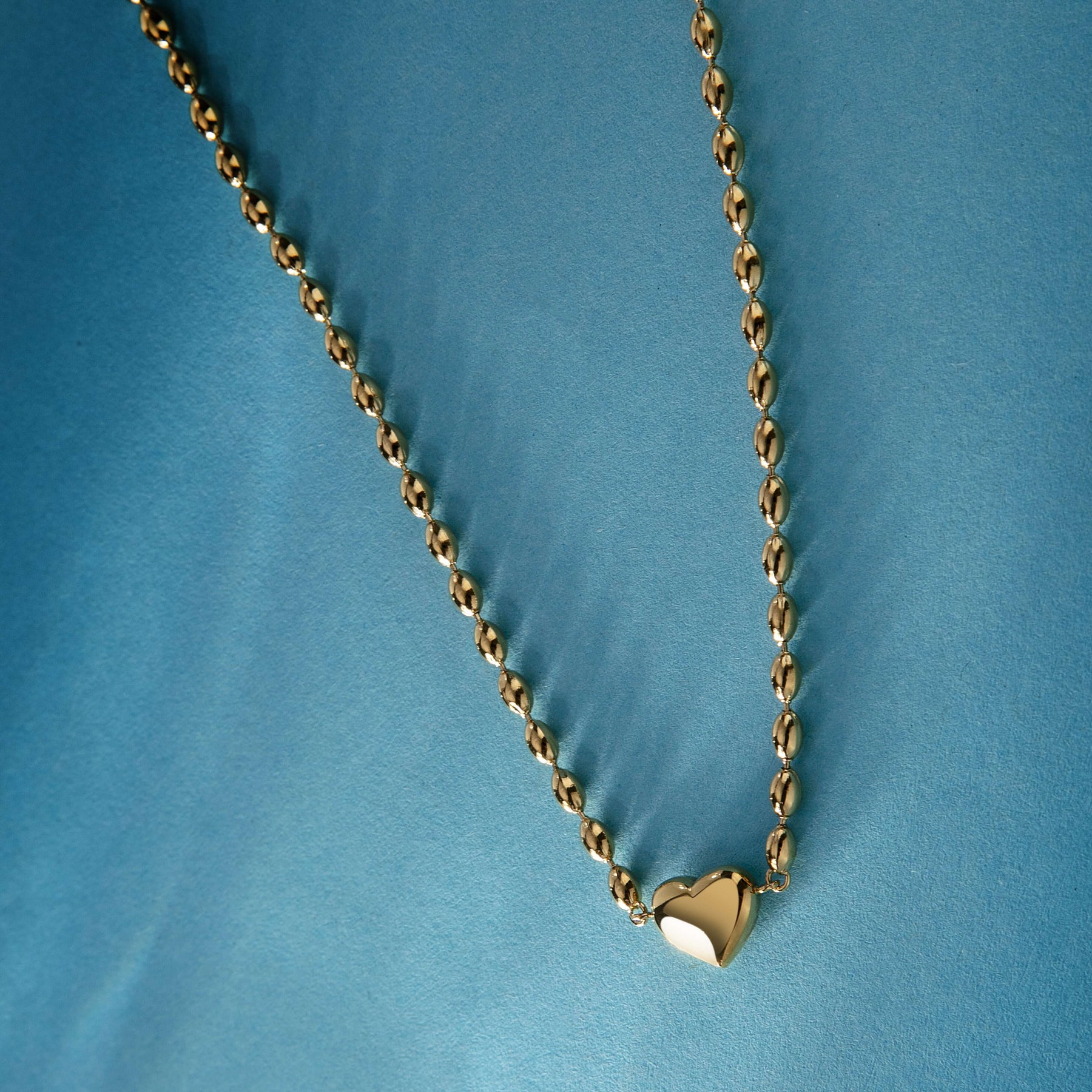 Нежно и модерно колие от висококачествена неръждаема стомана със златно PVD покритие, което осигурява дълготрайна устойчивост и блясък. В центъра е разположен изящен медальон във формата на сърце – символ на любов и нежност. Подходящо е както за ежедневна визия, така и като стилен акцент към елегантен тоалет. Идеален подарък за любим човек или специален повод.