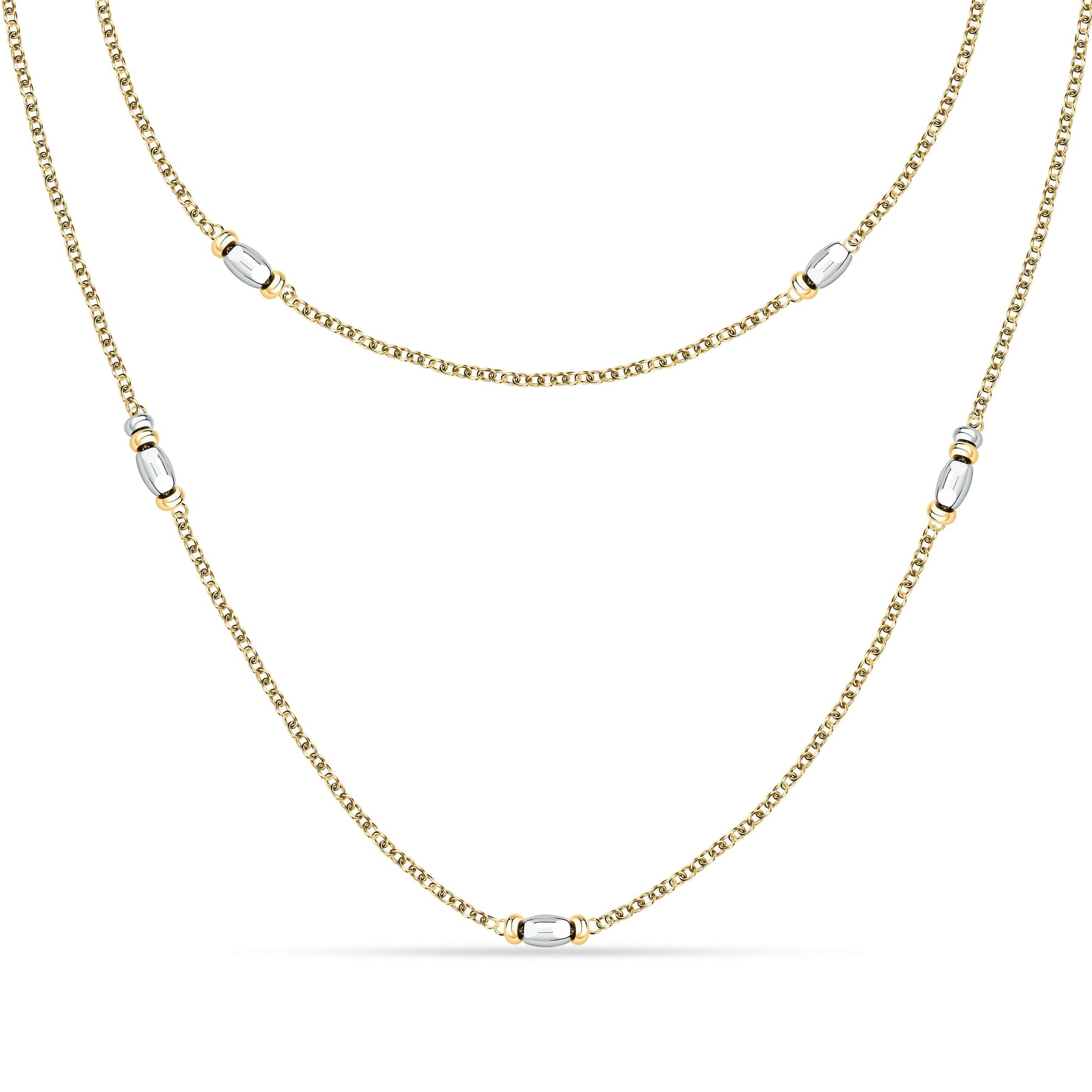 Стилно дамско колие от стомана със златно PVD покритие, декорирано с бели  цилиндрични елементи. SAXQ02. Дължина 90 см.