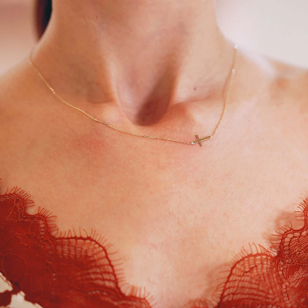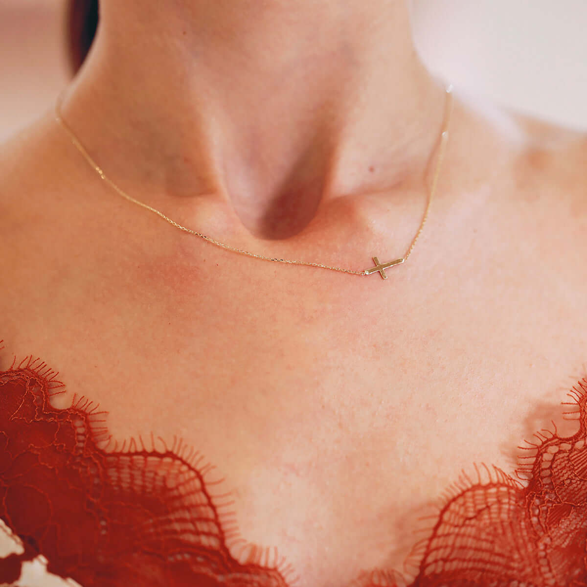 Златно колие с кръст добавя изтънченост и може да се комбинира лесно с други бижута за завършена визия.