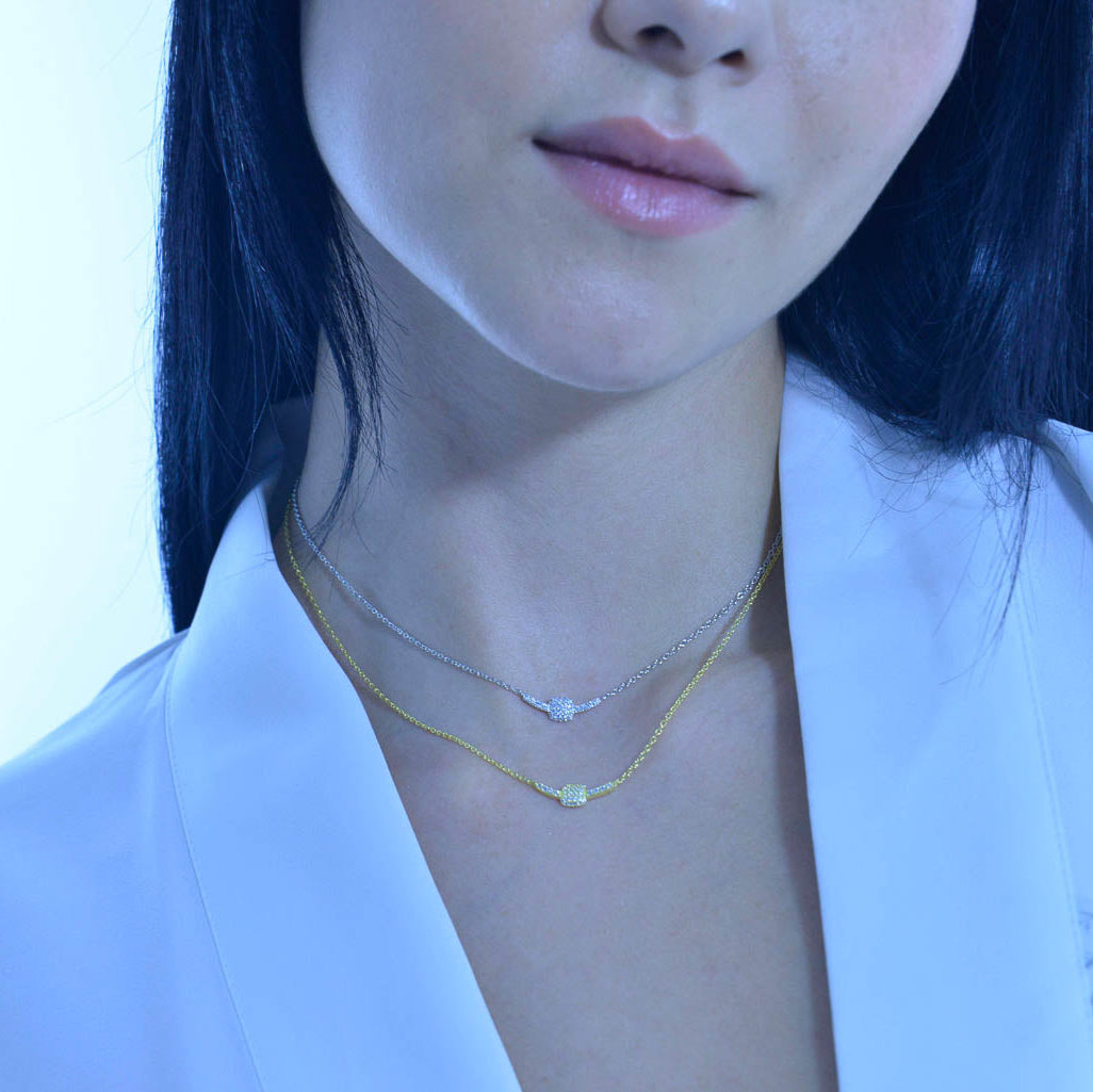 Елегантно и фино сребърно колие и циркони, което излъчва класа и изтънченост. Изработено от сребро 925 със златно покритие, това бижу впечатлява с минималистичен дизайн и блестящ централен елемент, обсипан с фини бели циркони. Верижката е деликатна и подчертава женствеността и стила на всяка дама.