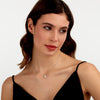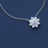 Родирано сребърно колие с цвете и циркони върху шия на модел, портрет.
