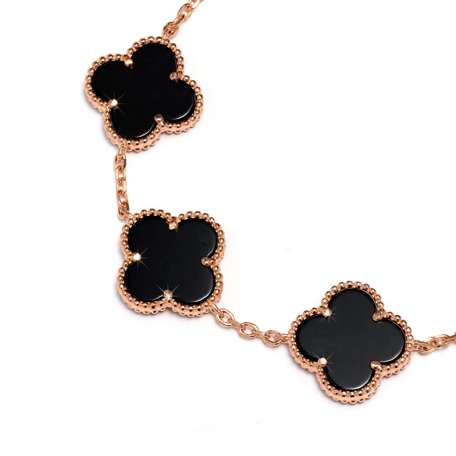 Сребърна гривна с розово златно покритие и пет детелини от черен оникс