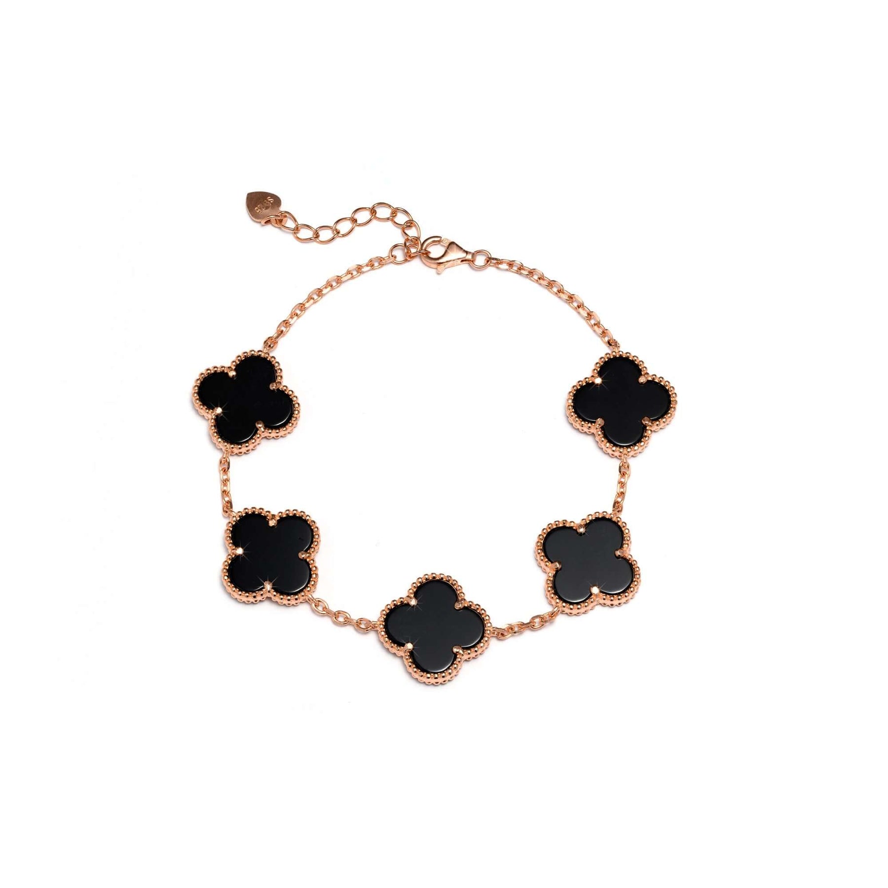 Сребърна гривна със розово златно пикритие и 5 детелини от оникс 15 мм | Senso Silve