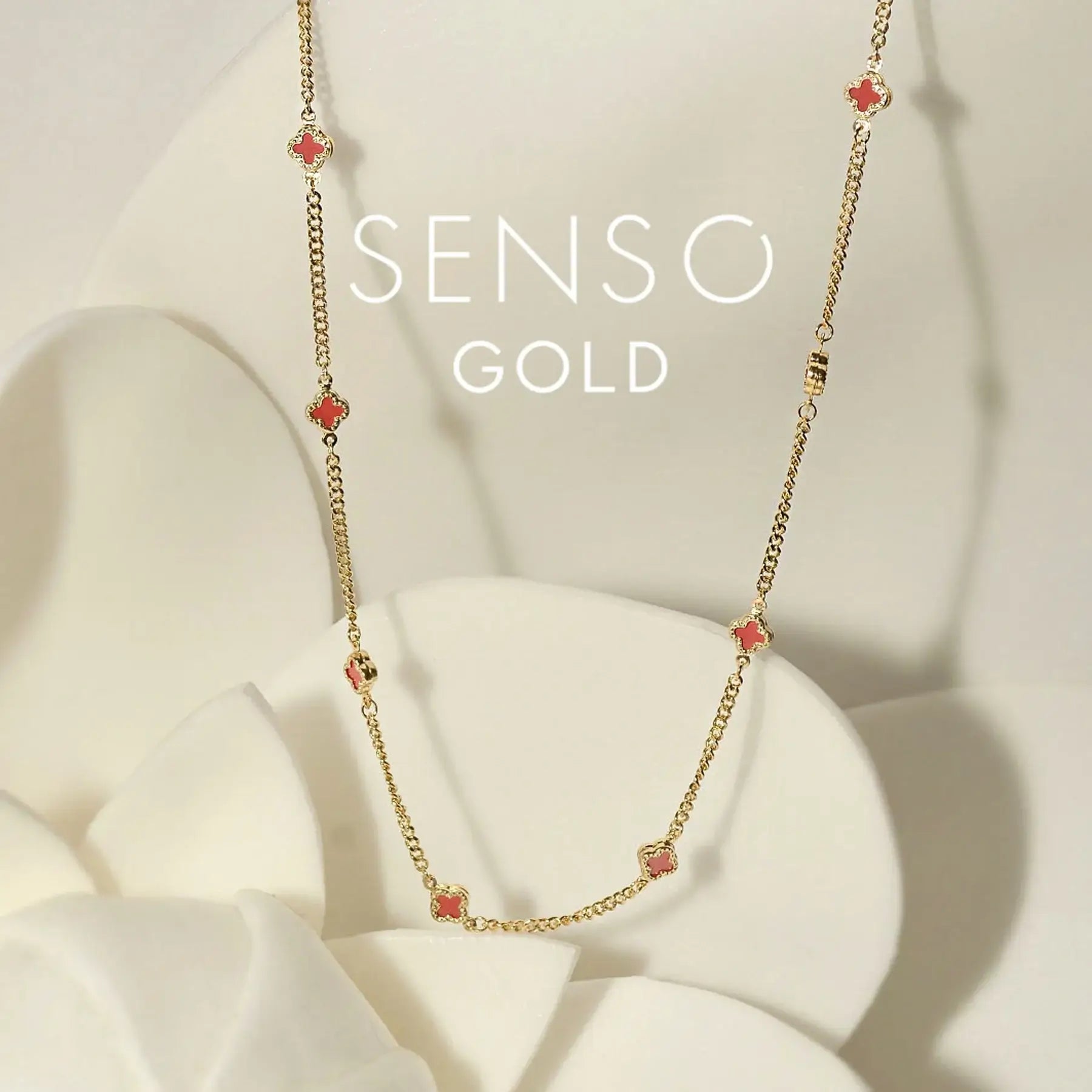 Колие от жълто злато 14K с червен Карнелиан – 9 детелини | Senso Gold