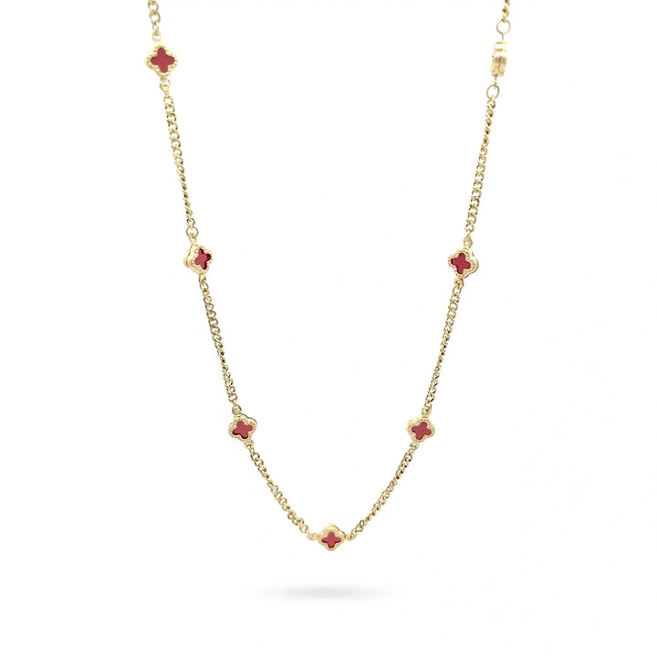 Колие от жълто злато 14K с 9 детелини от червен оникс – елегантен дизайн.