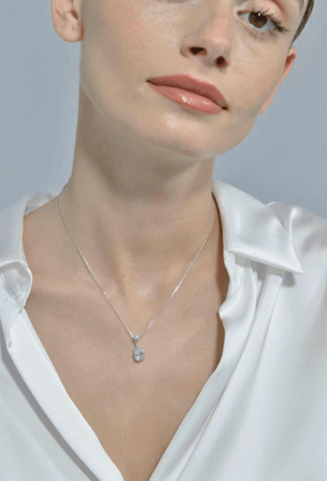 Дамско колие Salvatore Plata Wedding от сребро 925 с родиево покритие и капковиден циркон – снимка върху модел.