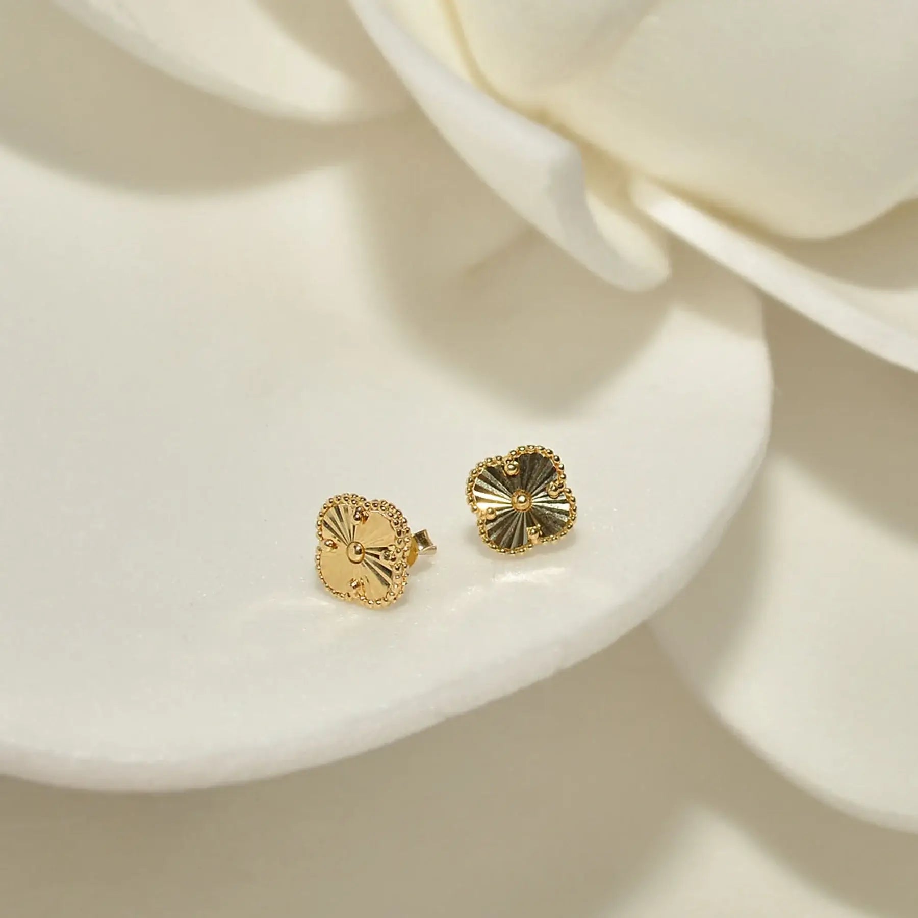 Елегантни обеци с форма на детелина, изработени от 14K жълто злато, с прецизен релефен дизайн и фино гравирани детайли. Леките отблясъци създават изискан блясък, който привлича вниманието и добавя класа към всяка визия.