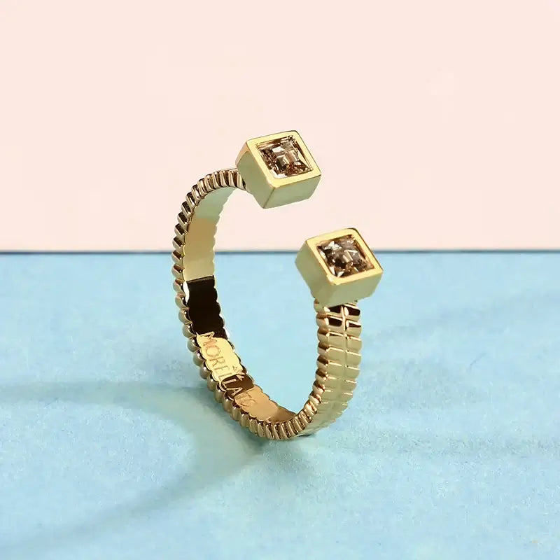 Близък план на отворен позлатен пръстен с два квадратни циркона на длан.