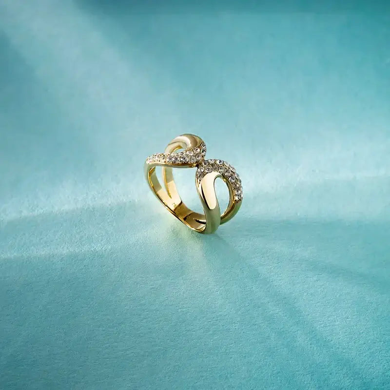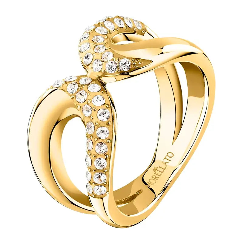 Скулптурен пръстен Morellato Design с двойна, преливаща линия и pavé инкрустация по горната дъга. Изработен е от неръждаема стомана със златно PVD покритие – по-устойчиво на износване от стандартното позлатяване. Блестящите бели кристали Ø1,5 мм са поставени плътно за равномерен, фин блясък. Закръгленият профил и гладката вътрешна шина осигуряват комфорт при целодневно носене. Идеален за соло акцент или комбиниране с тънки халки от същата серия.