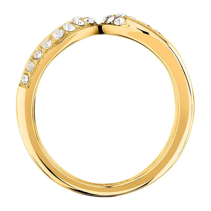Позлатен пръстен от неръждаема стомана със златно PVD и бели кристали, студиен кадър отпред.