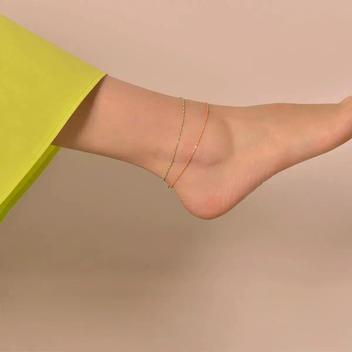 Почувствай свободата и стила на лятото с тази нежна гривна за крак / глезен, изработена от сребро 925 с позлатено покритие. Цялата е обсипана с златисти и ментови емайлирани мъниста, които придават настроение, цвят и усещане за лекота. Носи я с рокля, къси панталони или боси крака на плажа – ефектът е винаги впечатляващ.