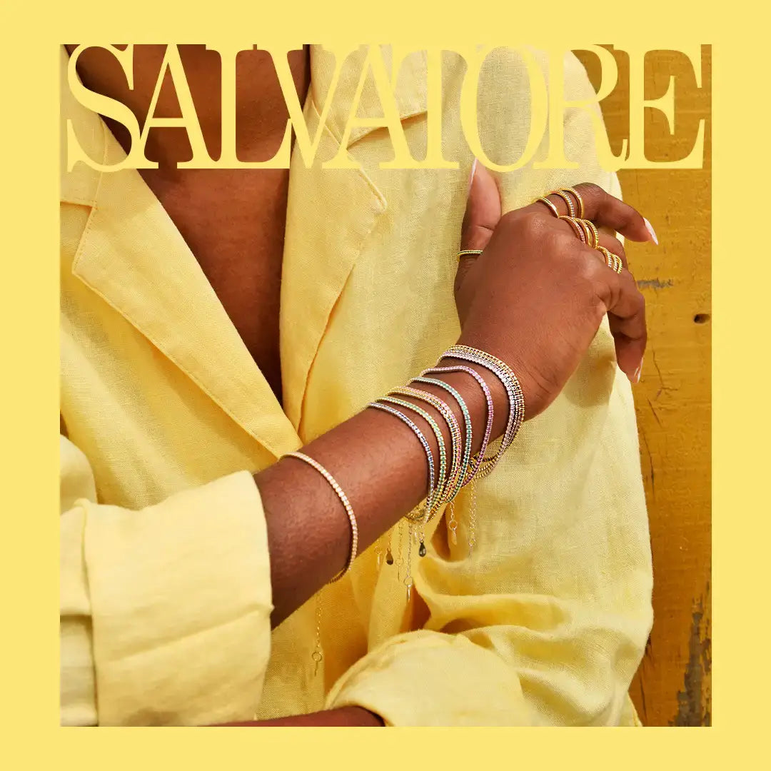 Модел носи няколко позлатени гривни ривиера, включително с розови циркони от колекция Blink