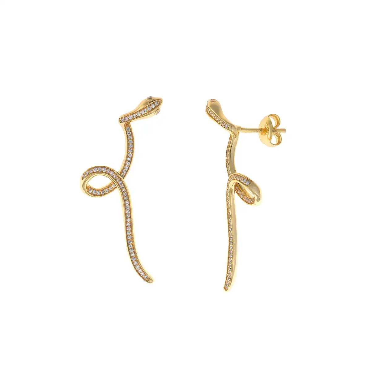 Уникални висящи обеци във форма на змия от сребро 925 с позлата, изцяло инкрустирани с бели циркони – за дръзка и елегантна визия.