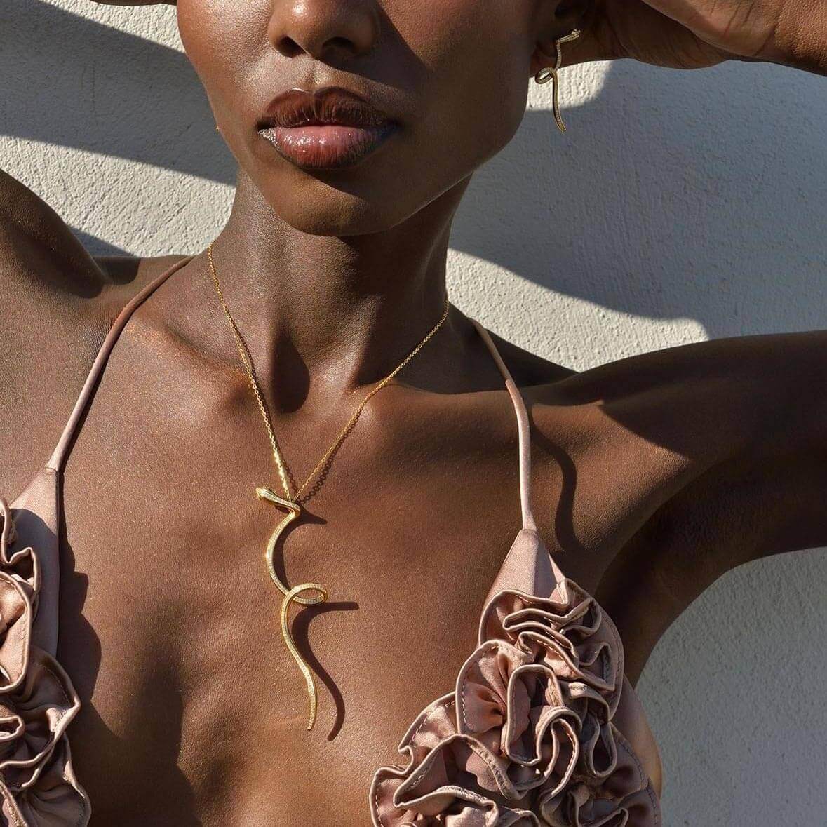 Модел носи позлатено колие змия с цирконии от колекция Jungle – лайфстайл визия