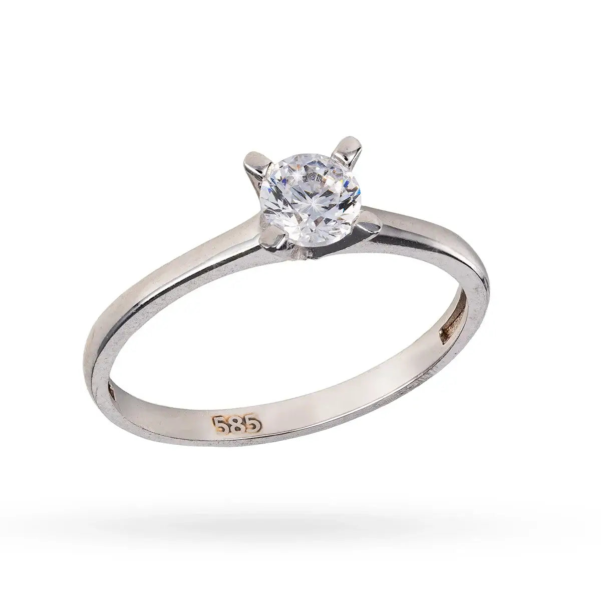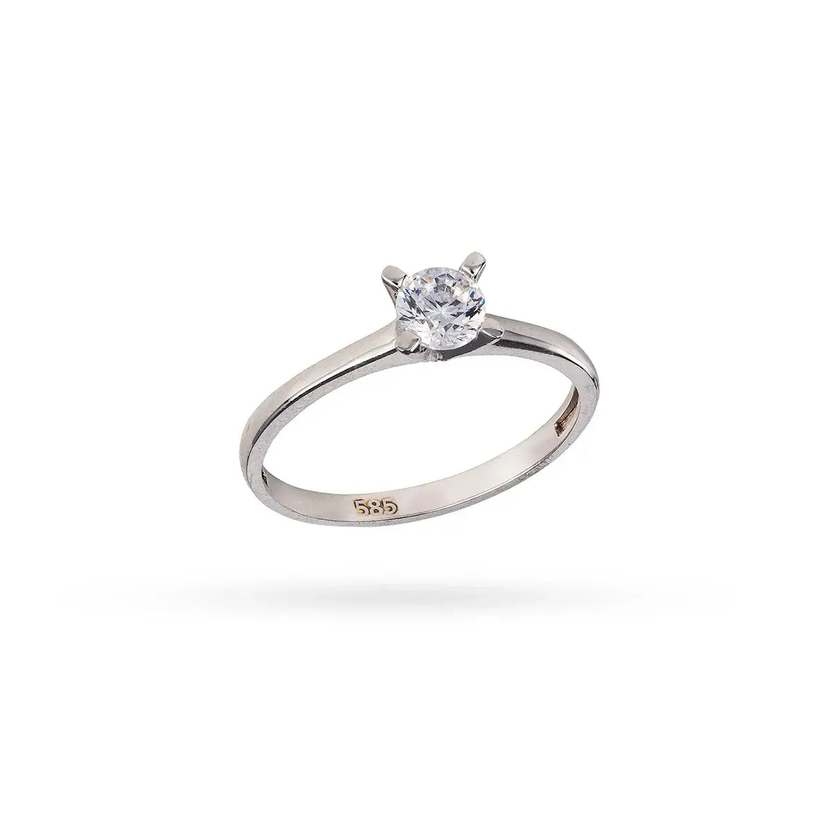 Бял златен пръстен с централен циркон и изчистена тънка халка