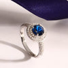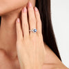 Сребърен пръстен 925 с родиево покритие, син централен циркон и бели циркони – студиен кадър отпред.