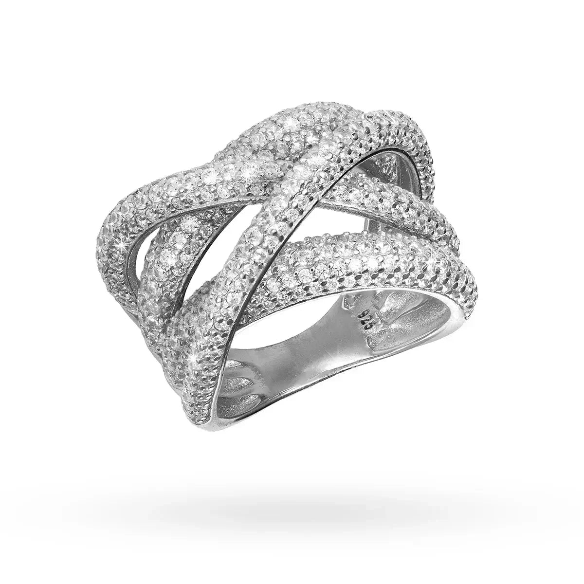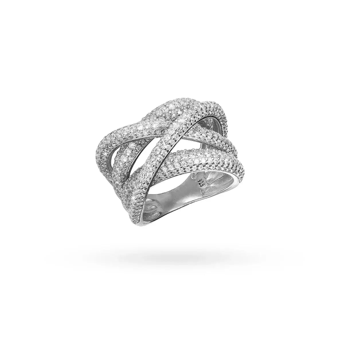 Ефектен и модерен сребърен пръстен с родиево покритие, изработен от няколко преплетени ленти, покрити с pavé инкрустация от фини циркони. Визията е динамична, изразителна и запомняща се – бляскав акцент, подходящ за вечерна визия или като смело ежедневно бижу.