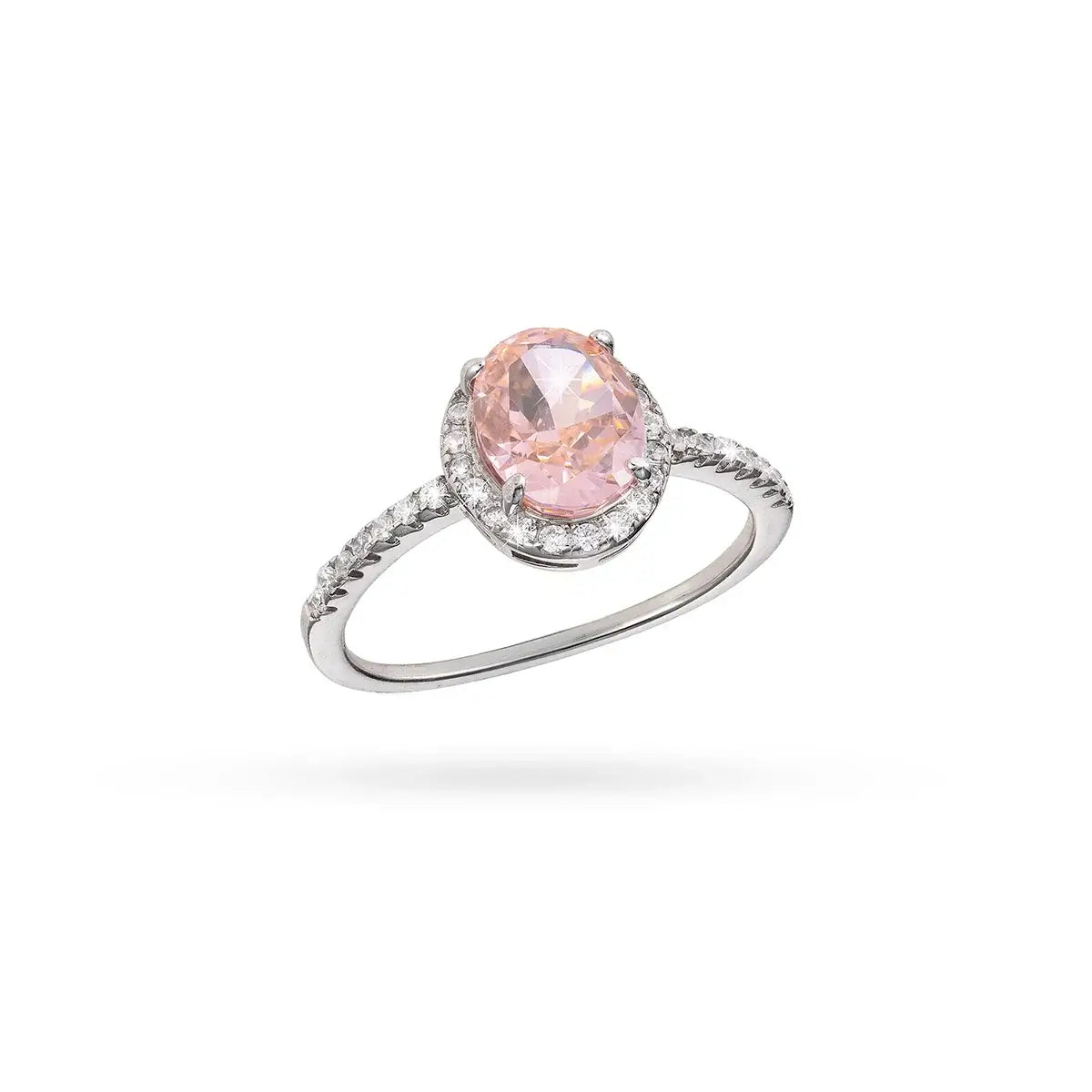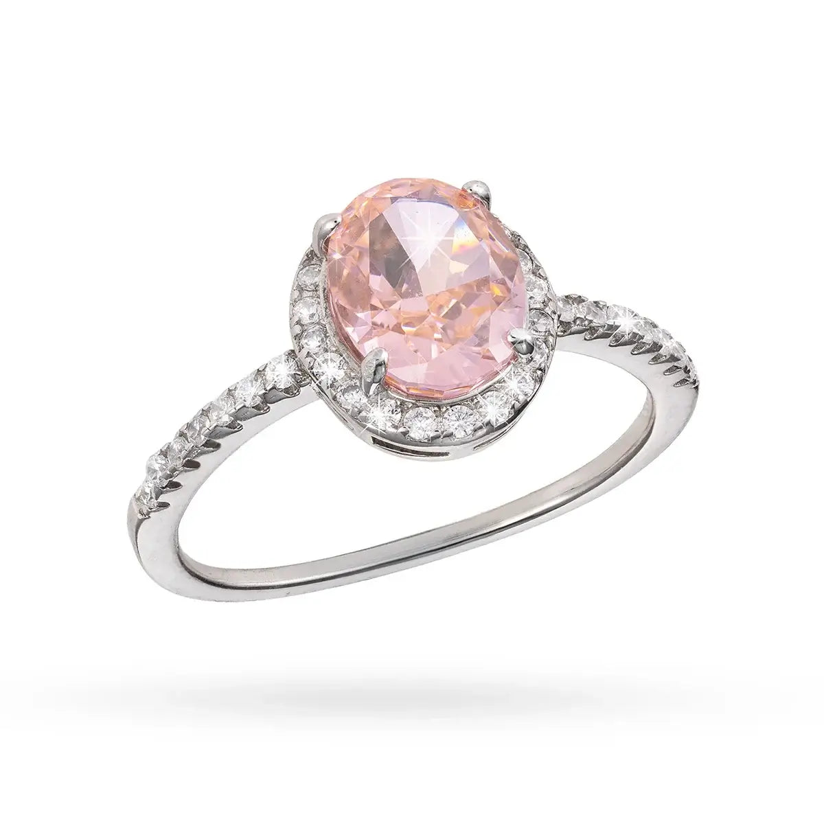 Елегантен сребърен пръстен с родиево покритие и впечатляващ розов овален циркон в центъра, заобиколен от сияйна инкрустация с малки бели камъни. Деликатната структура на халката е покрита с фино подредени циркони, които подсилват ефекта на лукс и прецизност.