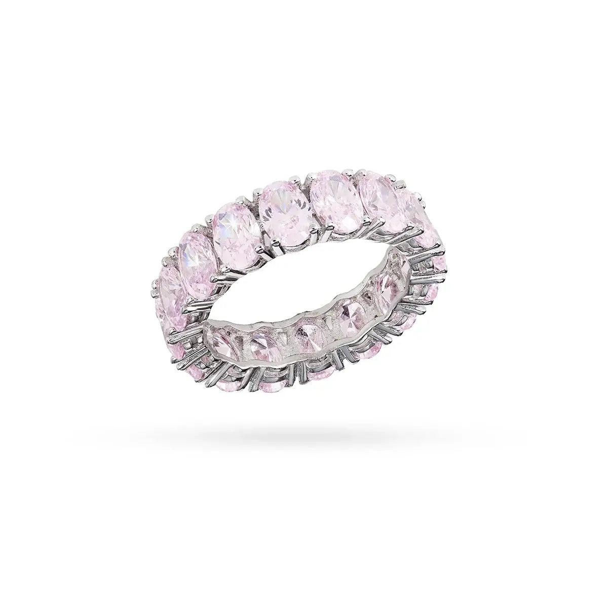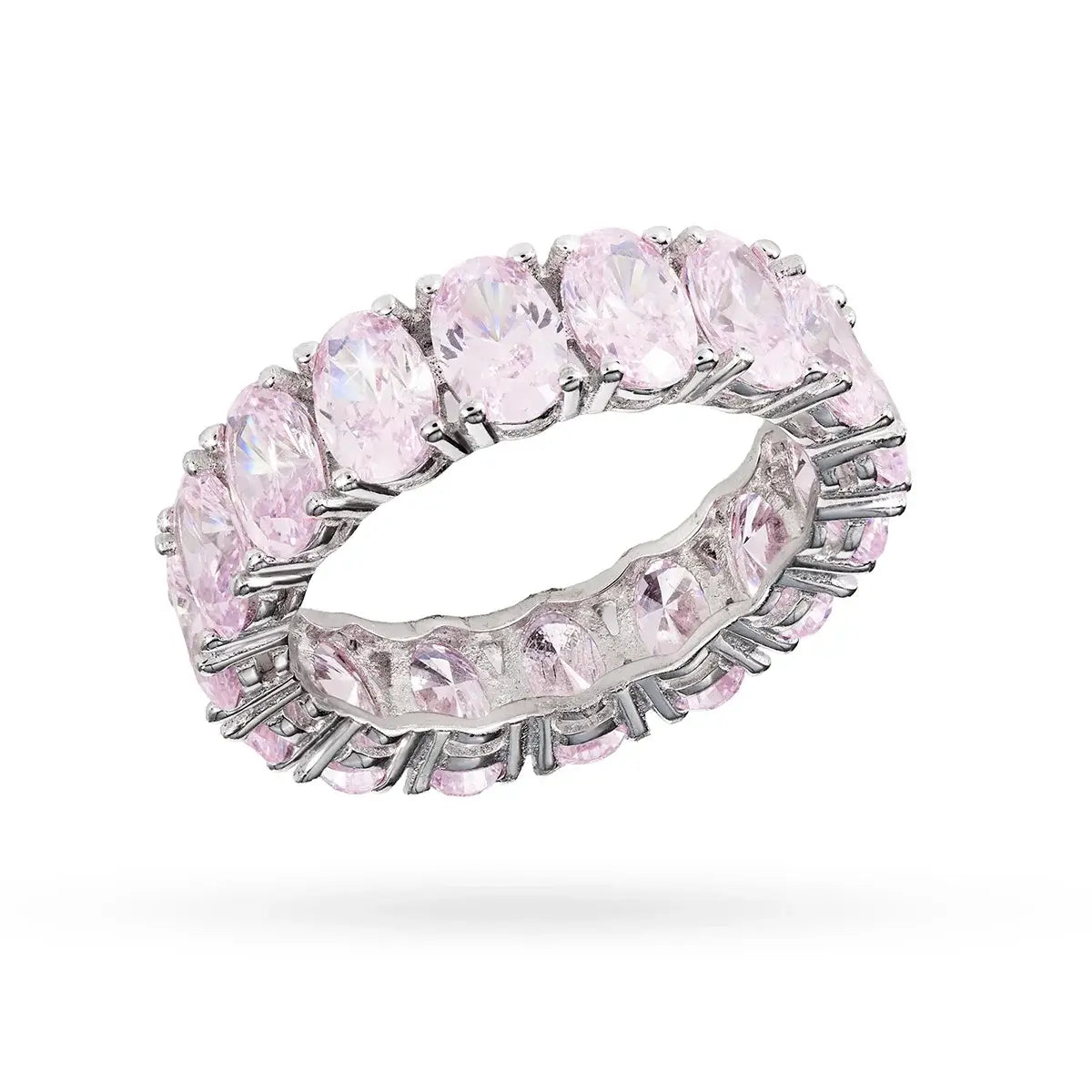 Бляскав сребърен пръстен с родиево покритие, изцяло обсипан с розови овални циркони, разположени в пръстеновиден безкраен силует. Всеки камък е прецизно монтиран със зъбчат обков, който осигурява стабилност и подчертава светлинния блясък.