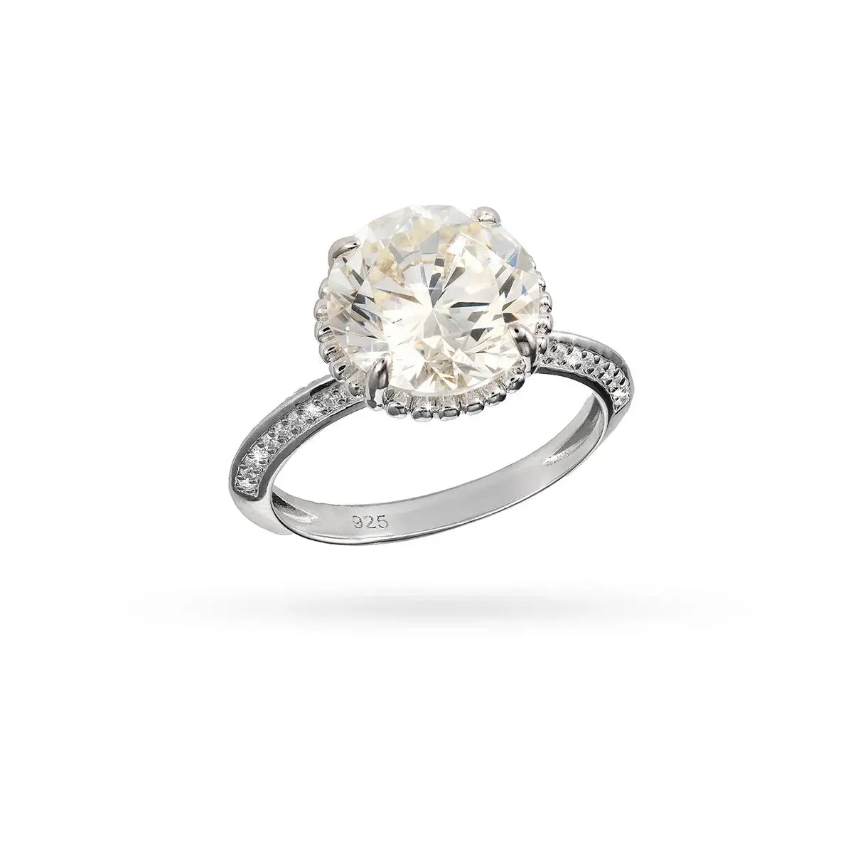 Класически и впечатляващ сребърен пръстен с родиево покритие, декориран с голям централен кръгъл циркон, монтиран в четири зъбчета. Камъкът е обграден от деликатни циркони, които се преливат плавно по горната част на халката, създавайки pavé ефект.