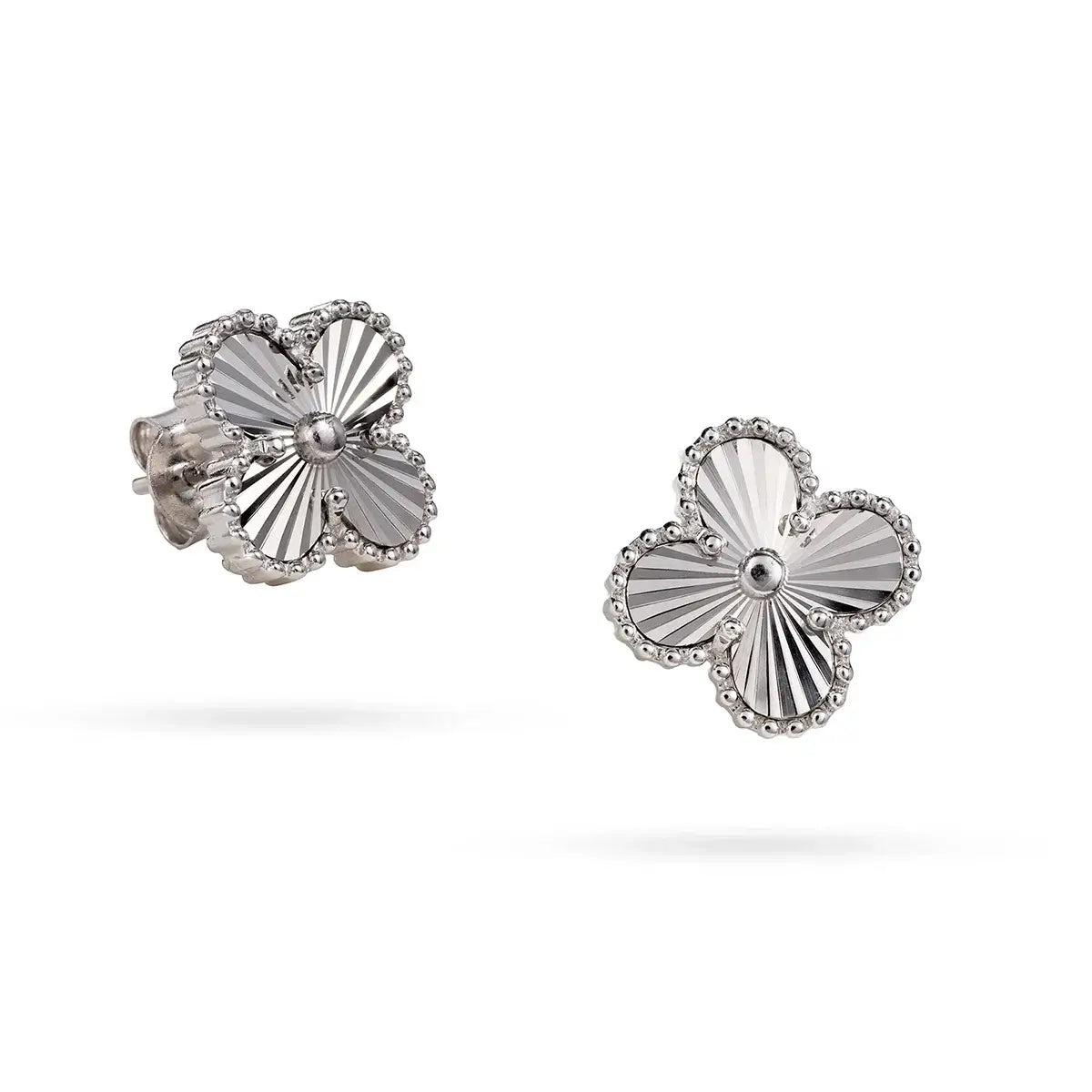 Изразителни сребърни обеци на винт с форма на детелина, изработени от висококачествено сребро с родиево покритие, което осигурява дълготраен блясък и защита от потъмняване. Централният релеф създава ефект на светлинно разсейване, което придава динамика и изтънченост на визията.