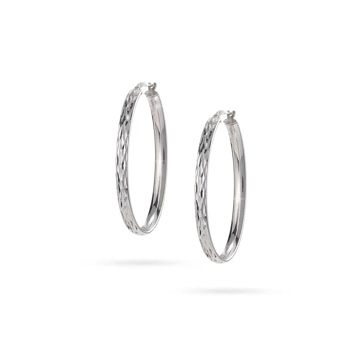 Елегантни сребърни обеци халки - 4см, които съчетават минимализъм и изтънчен стил. Изработени от висококачествено сребро с родиево покритие, те притежават огледален блясък и устойчивост срещу потъмняване. Повърхността е прецизно фасетирана, създавайки усещане за движение на светлината и допълнителен визуален ефект.
