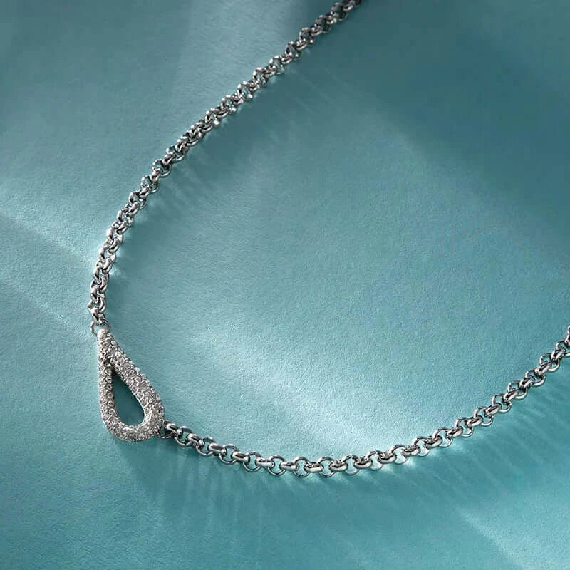 Близък план на висулка „капка“ с бели кристали върху сребриста верига.