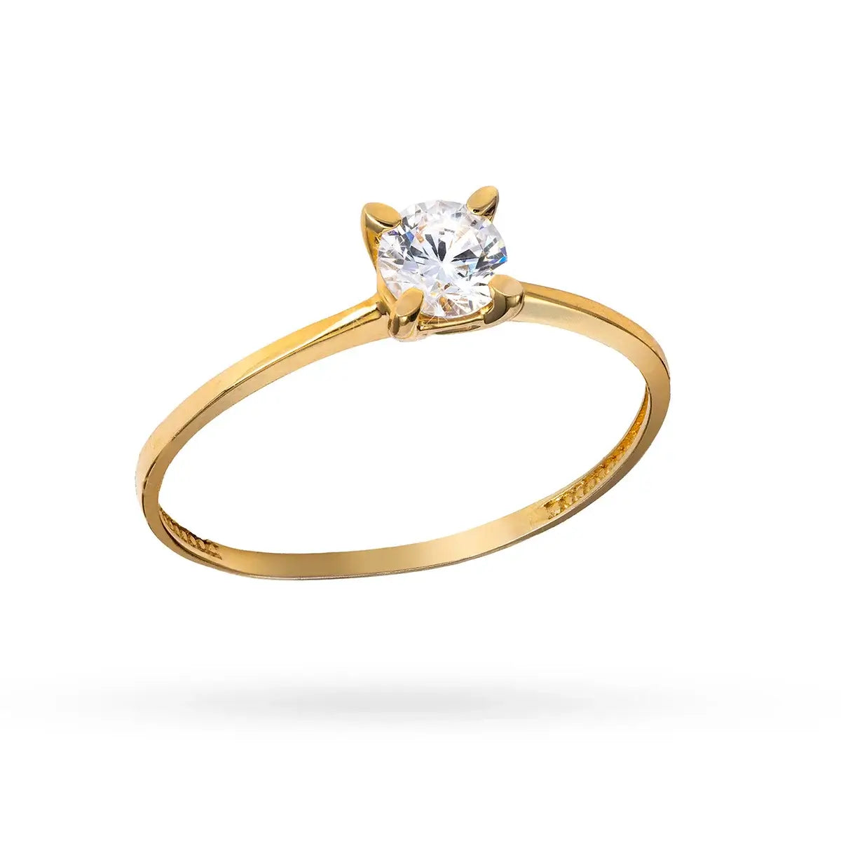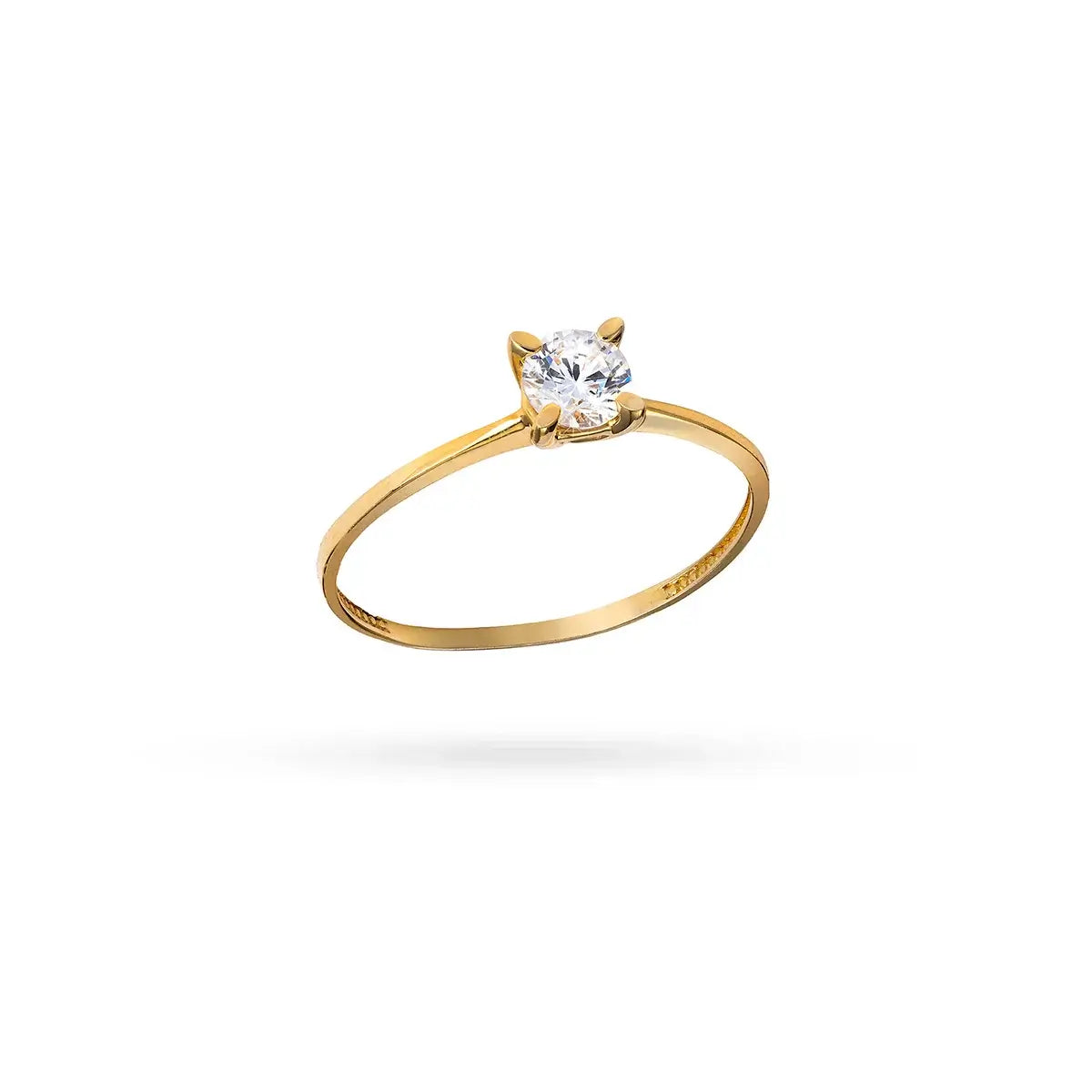 Фин и изключително елегантен златен пръстен с централен циркон, изработен от 14-каратово злато. Камъкът е монтиран с четири зъбчета, а лентата е деликатно извита, за да създаде усещане за плавен преход и баланс между блясък и минимализъм.