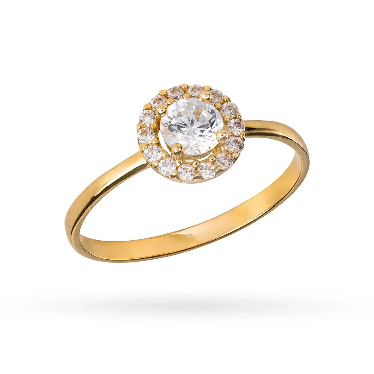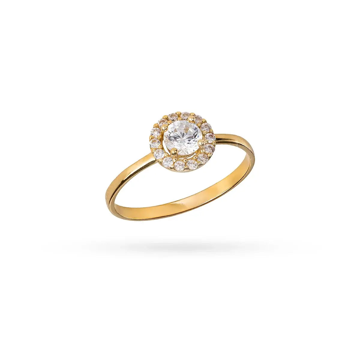 Изтънчен златен пръстен с централен кръгъл циркон, обграден от кръг от малки бели циркони, които създават впечатляващ „halo“ ефект. Основният камък е поставен с четири зъбчета и излъчва блясък и елегантност от всеки ъгъл.