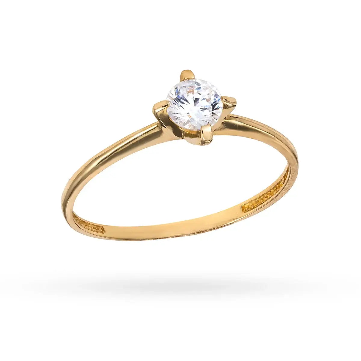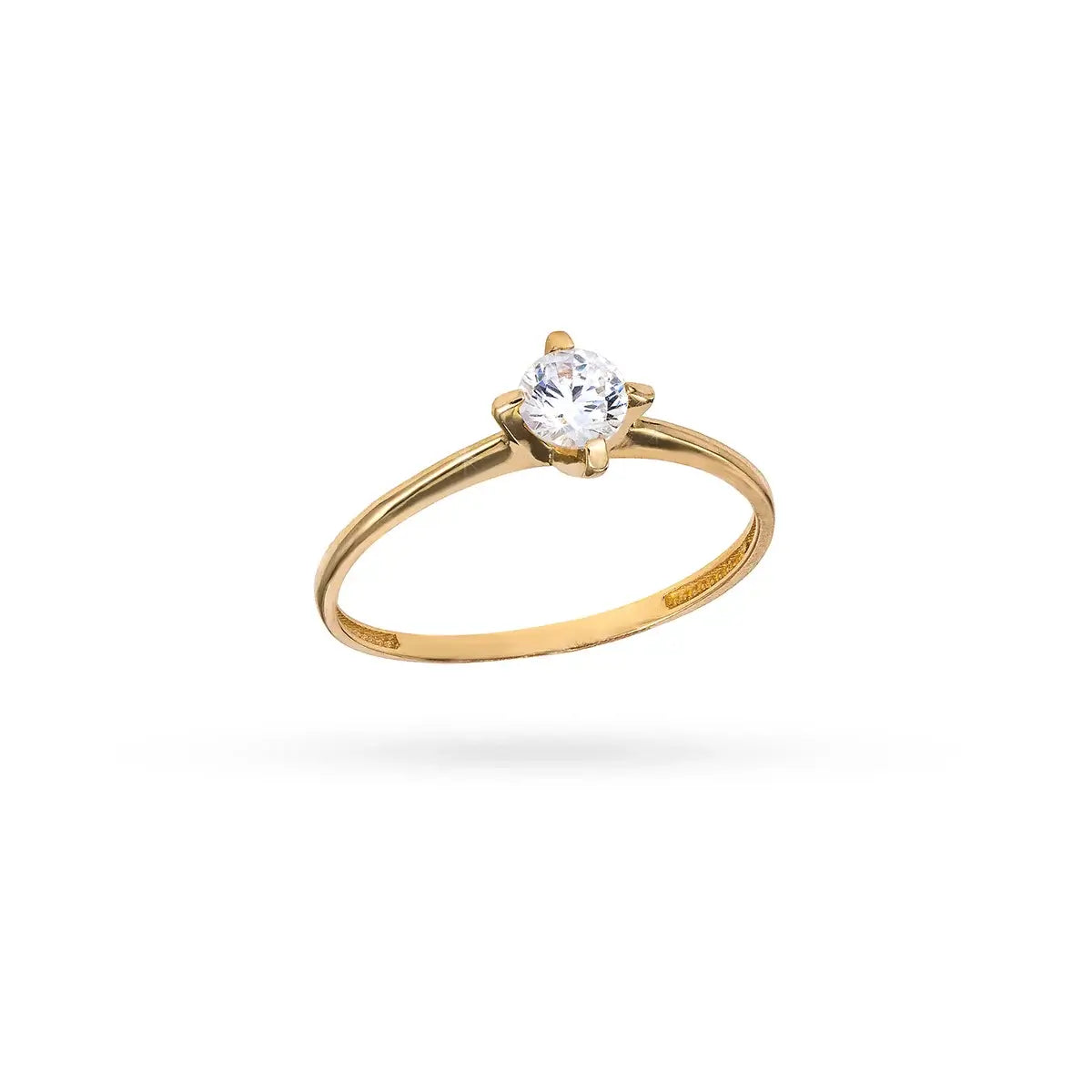 Семпъл и класически златен пръстен с централен циркон, монтиран с четири здрави зъбчета, които подчертават блясъка и симетрията на камъка. Халката е тънка, изчистена и лека, създадена да акцентира върху централния камък, без излишни детайли.