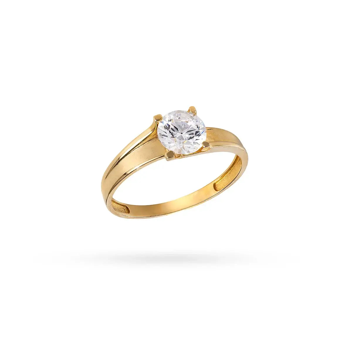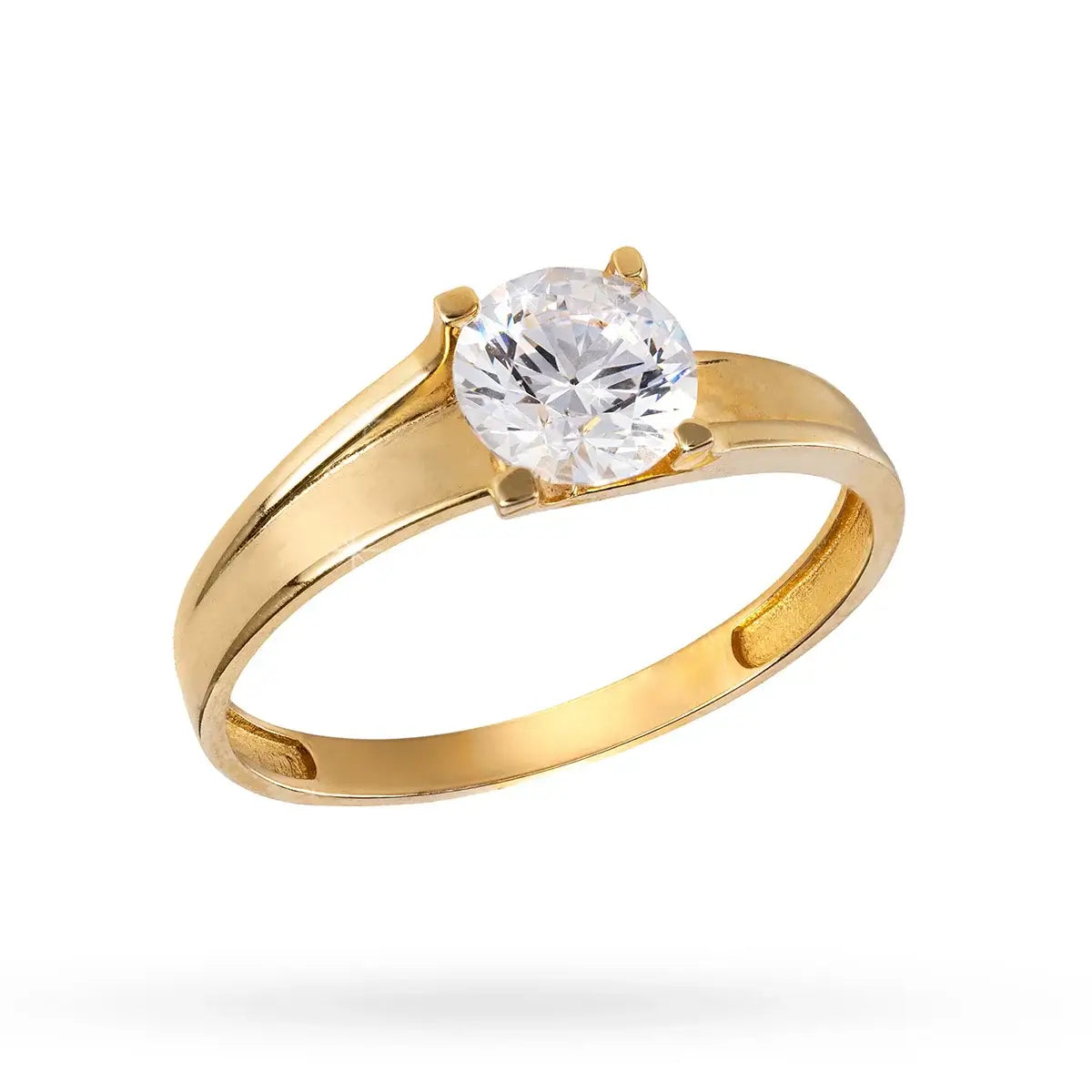 Класически и елегантен златен пръстен с централен циркон, монтиран с четири зъбчета върху широка, стабилна и гладка златна халка. Дизайнът е изчистен, но запомнящ се – подчертава блясъка на камъка и придава усещане за стабилност и лукс.