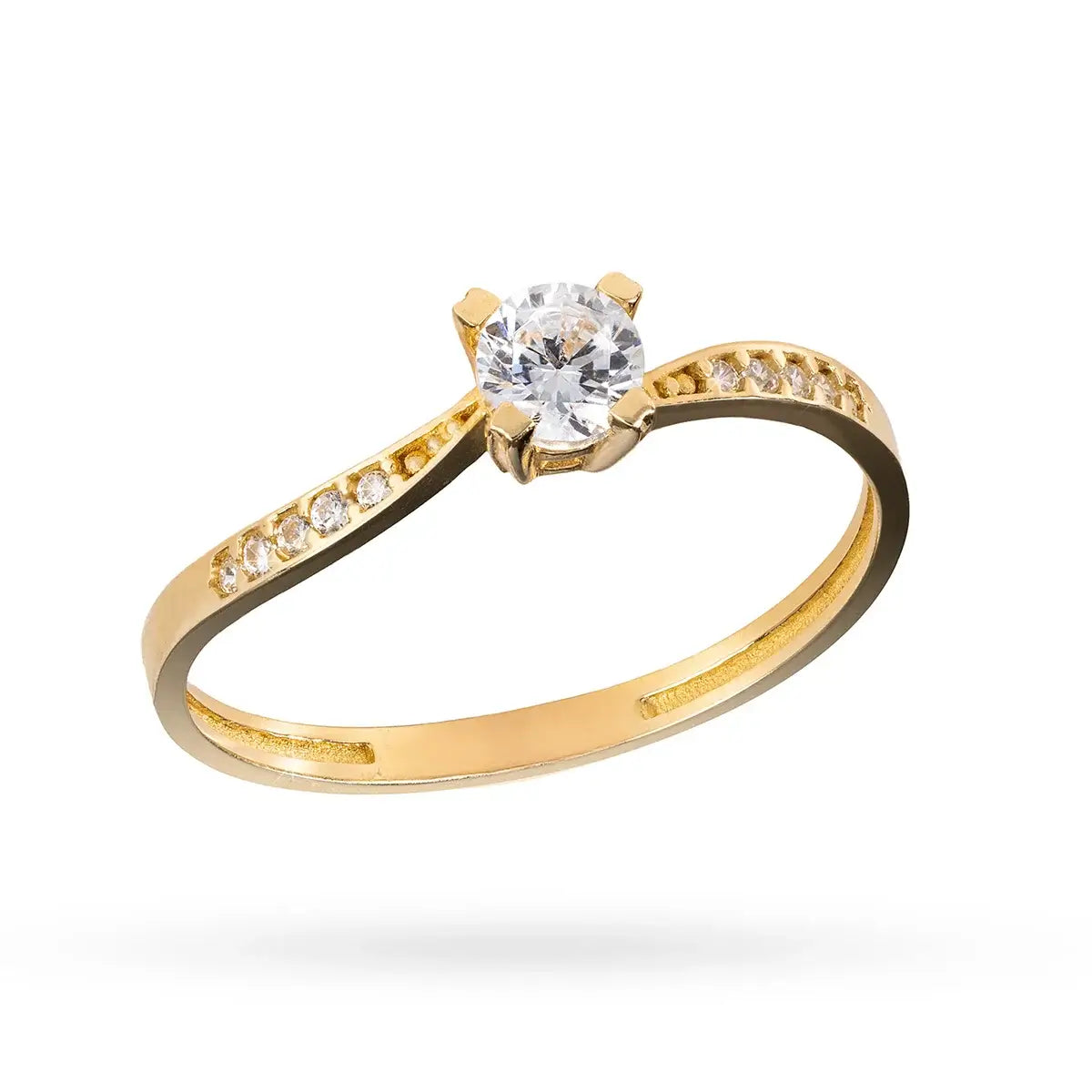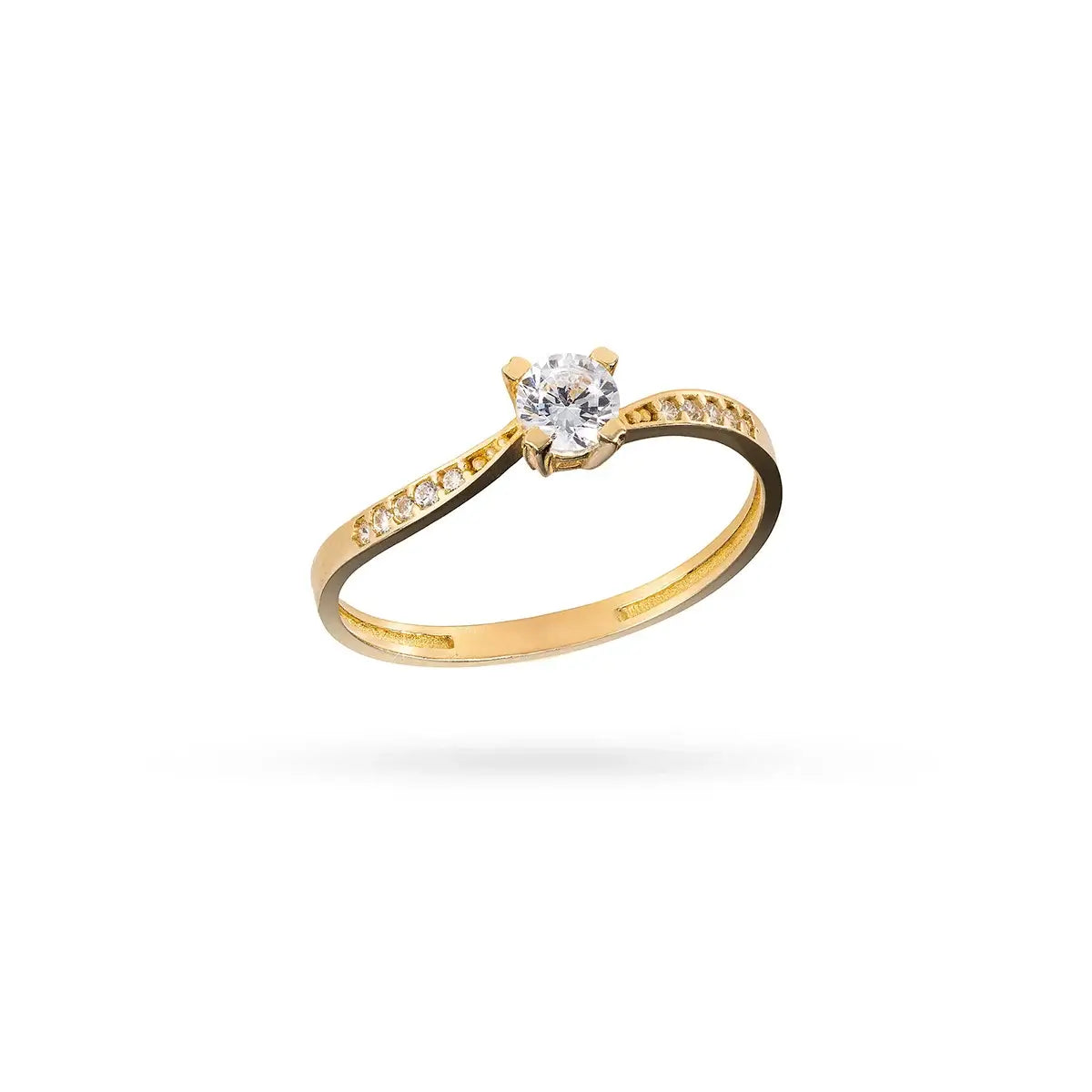 Елегантен златен пръстен с циркони по лентата и централен камък