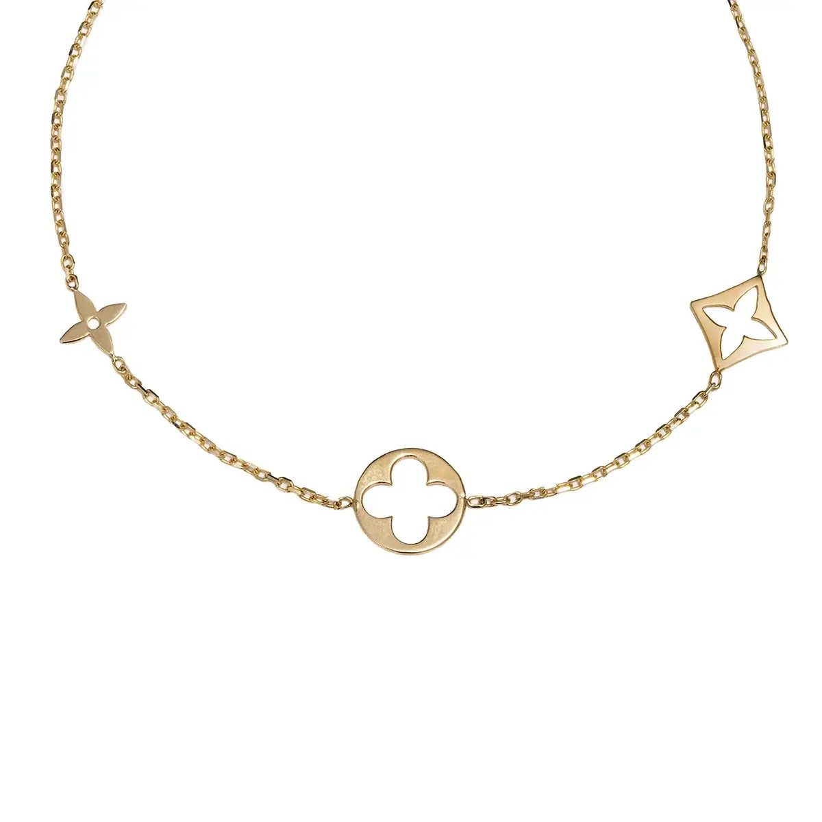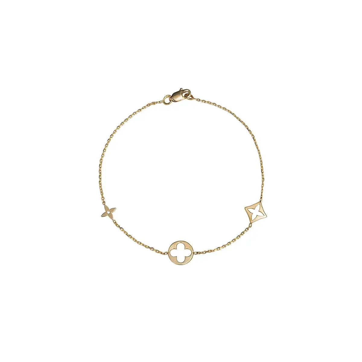 Елегантна и модерна златна гривна, изработена от 14-каратово злато с изчистен и изтънчен дизайн. Моделът е украсен с три стилизирани флорални елемента – кръгъл, квадратен и звезден силует, които придават уникалност и артистичност на бижуто.