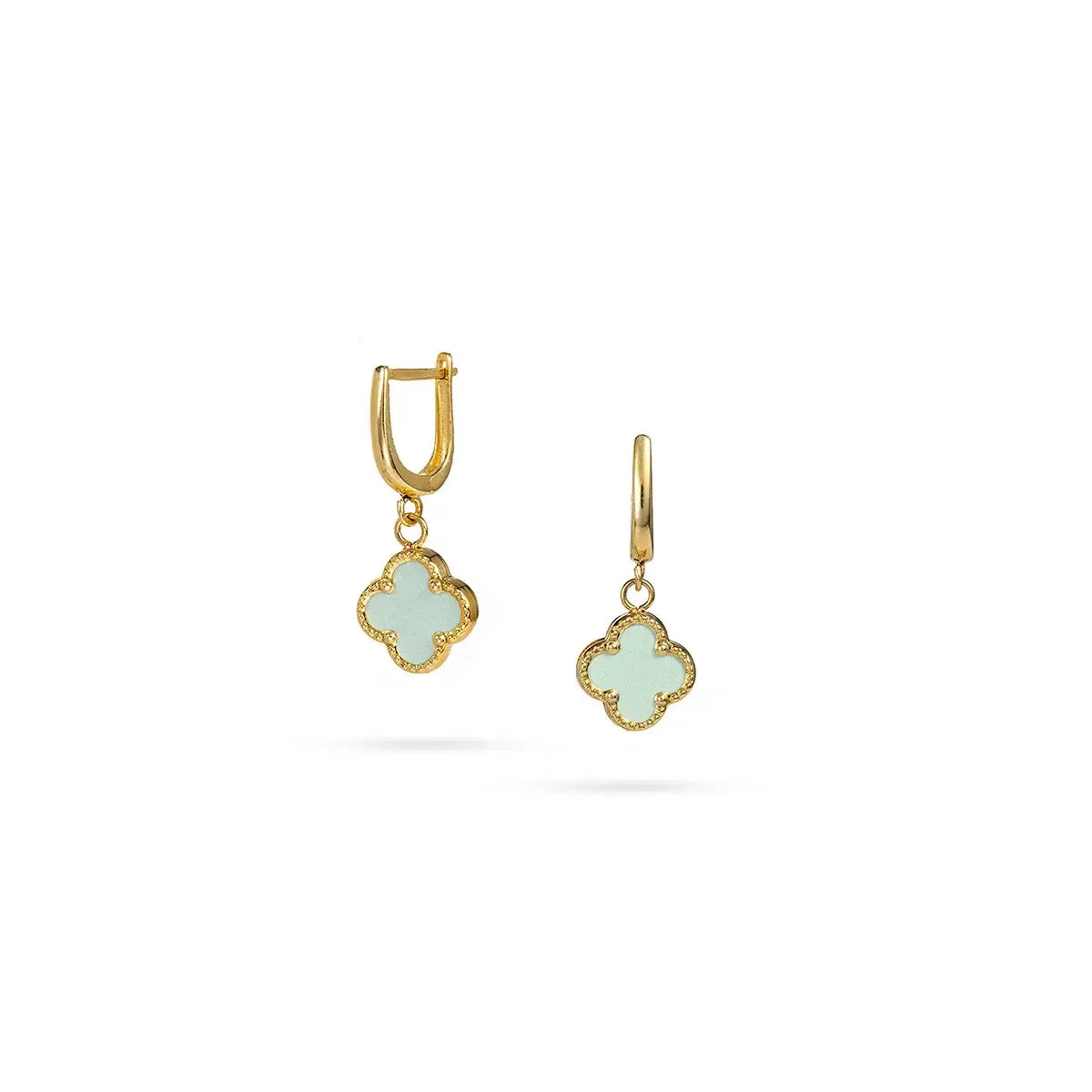 Златни висящи обеци с детелини и зелен камък с английска закопчалка | Senso Gold