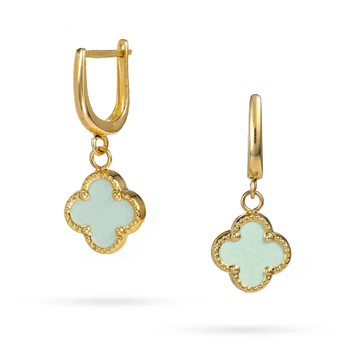Нежни и стилни златни обеци с детелина, изработени от 14-каратово злато и декоративен зелен камък във формата на стилизирана четирилистна детелина. Контурът е обрамчен с фино златно топче, което подчертава формата и придава луксозно винтидж излъчване.