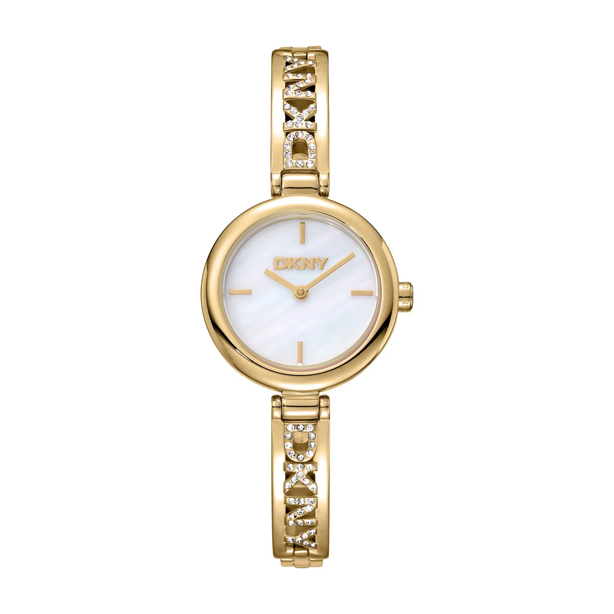Дамски часовник DKNY Logo Bangle – златиста стомана, бял седефен циферблат и гривна с логотип, модел DK1L115M0225
