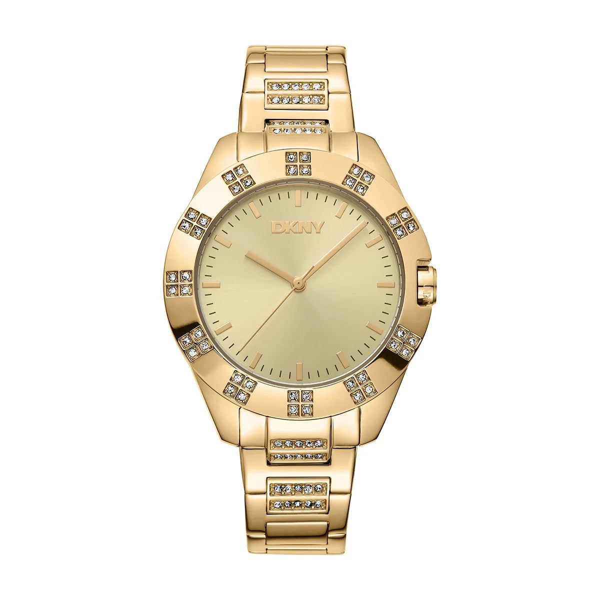 Дамски часовник DKNY Park Ave Glitz – златиста стомана, шампански циферблат и кристали, часовник DKNY модел DK1L019M0035