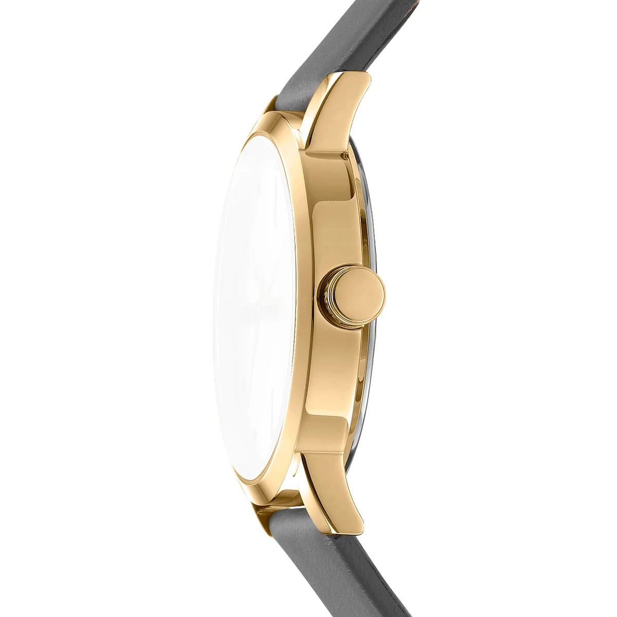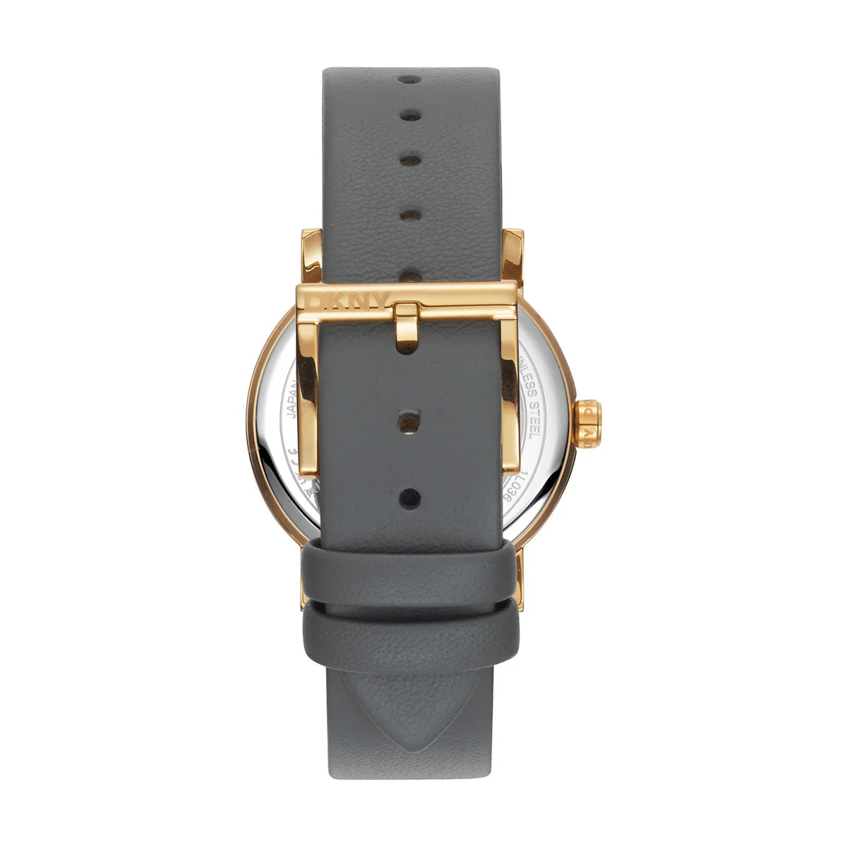 Гръб на дамски часовник DKNY Soho Midi – сива кожена каишка 18 мм и златиста катарама, модел DK1L036L0025