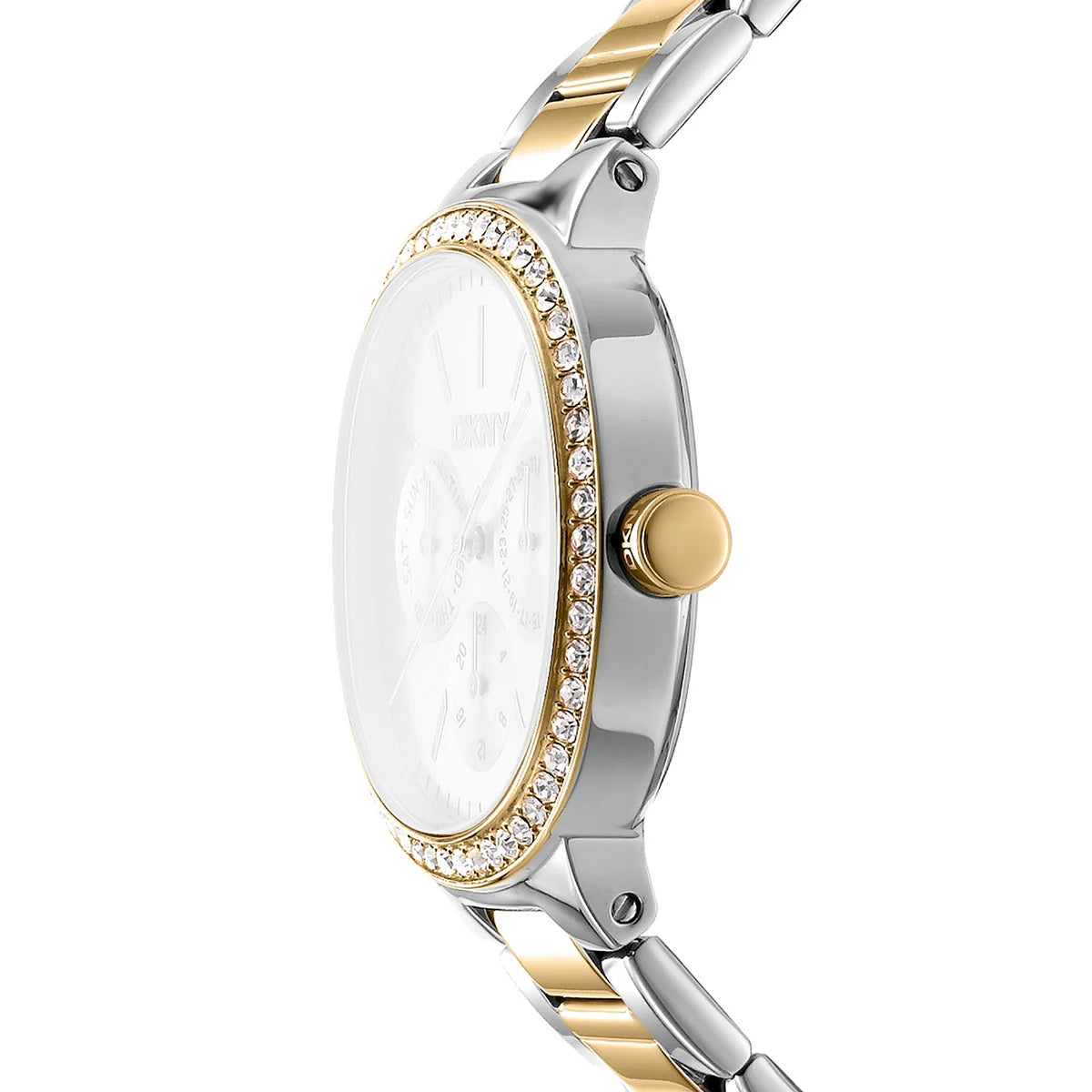 Дамски часовник DKNY – двуцветна стомана, мултифункция (ден/дата/24 ч.) и кристален безел, 36 мм, модел DK1L084M0085