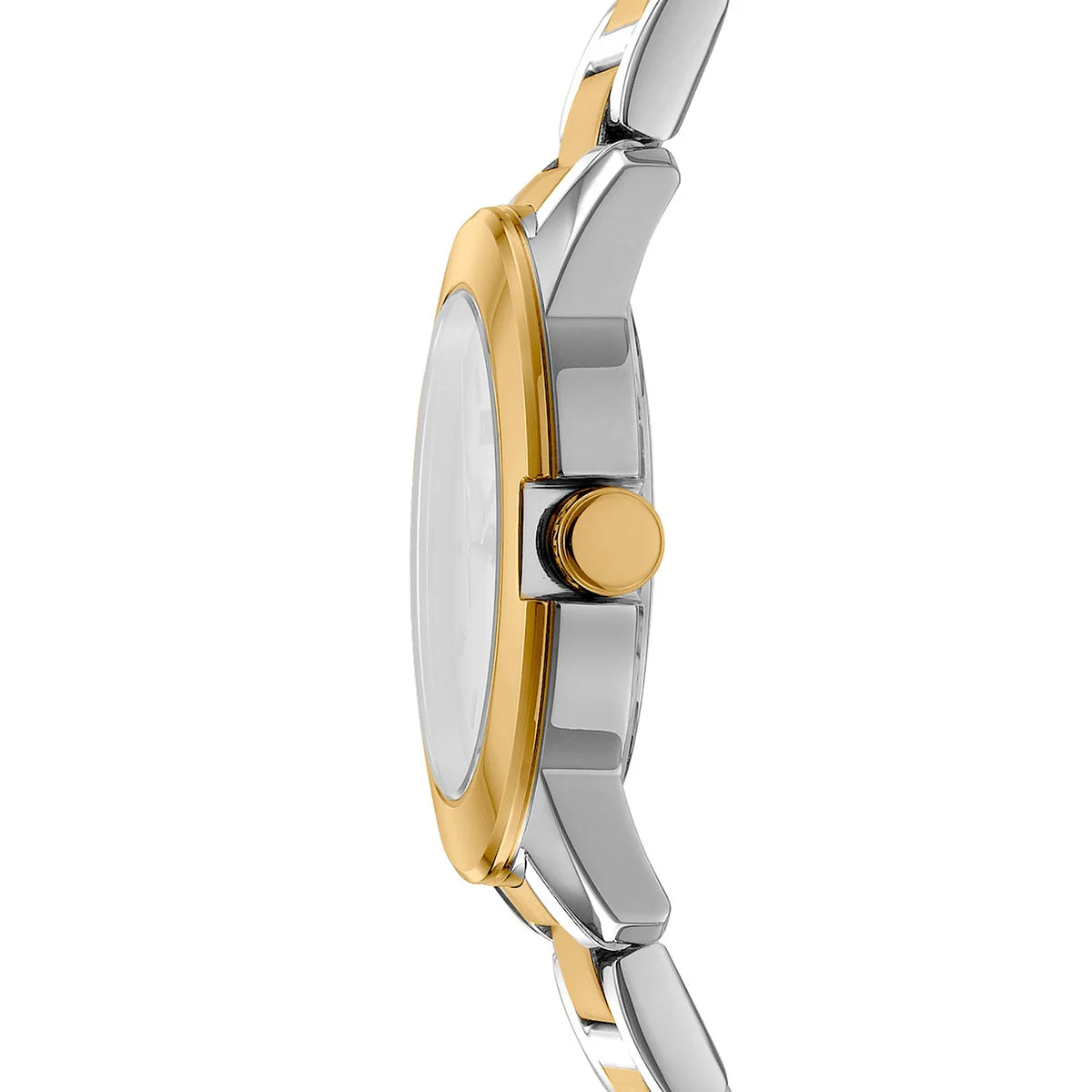 Elegant ceas de damă din oțel bicolor, combinând strălucirea modei cu confortul zilnic. Bezelul lat auriu evidențiază cadranul alb sidefat (MOP) cu finisaj solar și markeri fini de index, iar brățara din oțel cu elemente centrale aurii adaugă un finisaj rafinat.