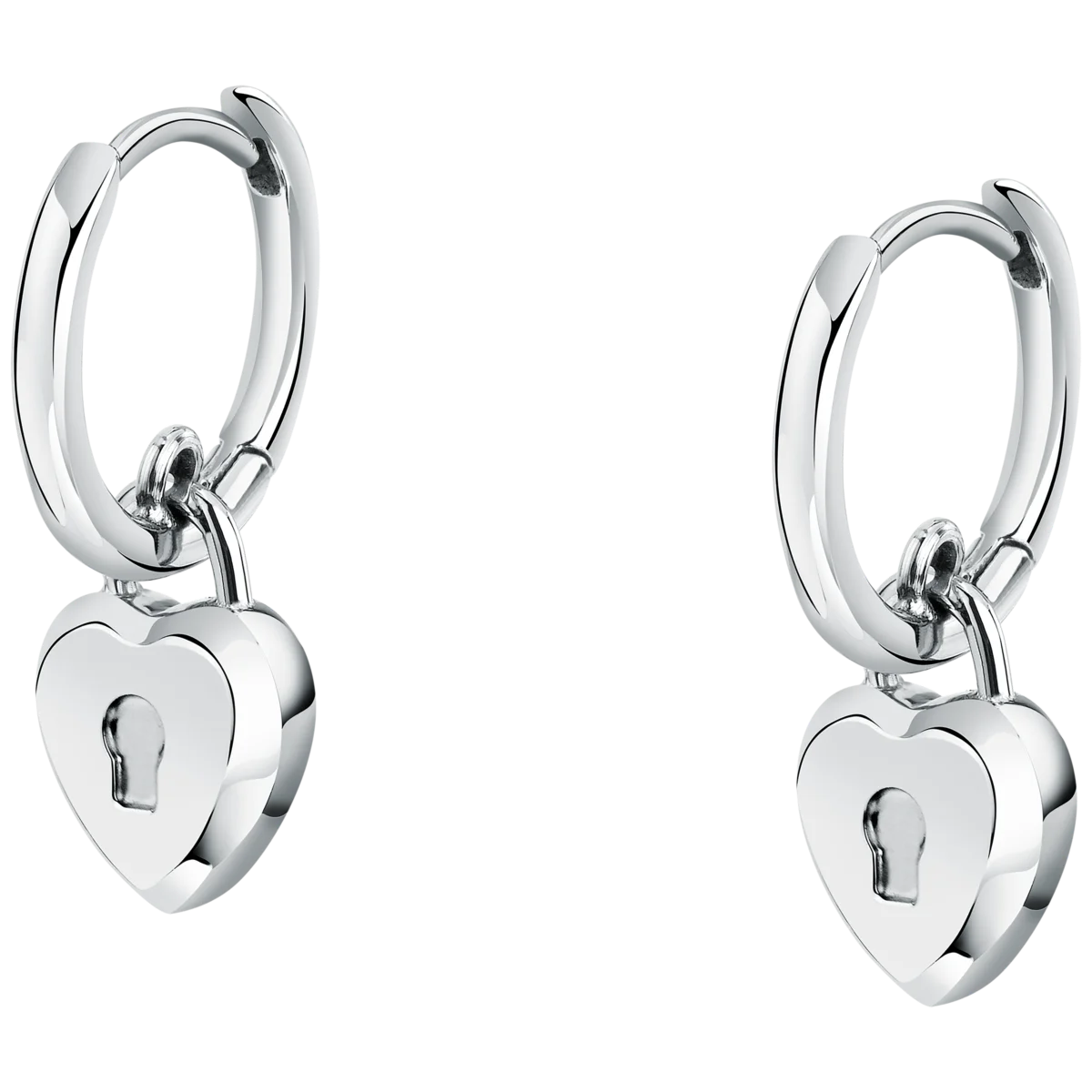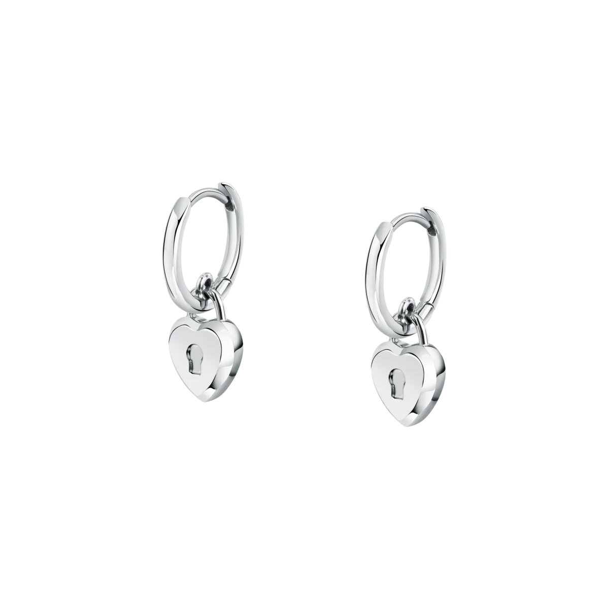 Сребристи обеци халки Karl Lagerfeld от неръждаема стомана с висулка сърце катинар, дължина 2,2 см. Романтичен подарък – поръчай онлайн.