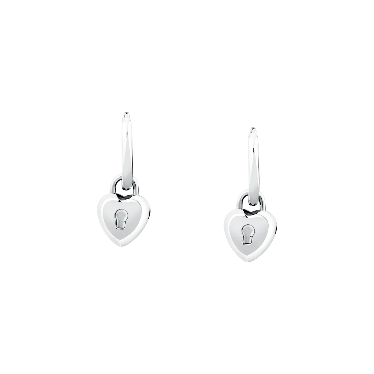 Дамските обеци Karl Lagerfeld Charms KLAYD23 са нежно бижу с ясно послание – „заключено“ сърце. Изчистените сребристи халки са допълнени от малки висящи висулки сърце във форма на катинар, върху които е гравирана стилизирана ключалка. Резултатът е романтичен, но модерен акцент, който стои прекрасно както с дънки и тениска, така и с елегантна рокля.