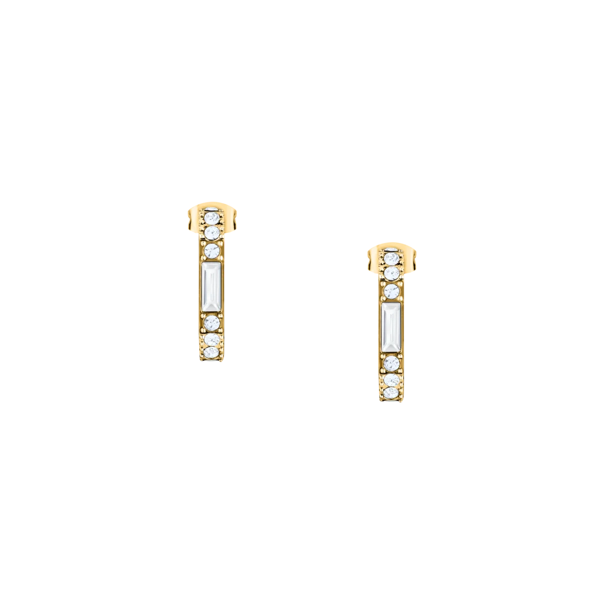Тези дамски обеци Karl Lagerfeld Crystals са малки, но впечатляващи „халки“, които озаряват лицето с блясък. Гланцираната златиста стомана оформя геометрична полуобръч форма, а предната част е изцяло покрита с искрящи бели кристали и издължен багетен камък в центъра – ефектен детайл, който придава дълбочина и движение.