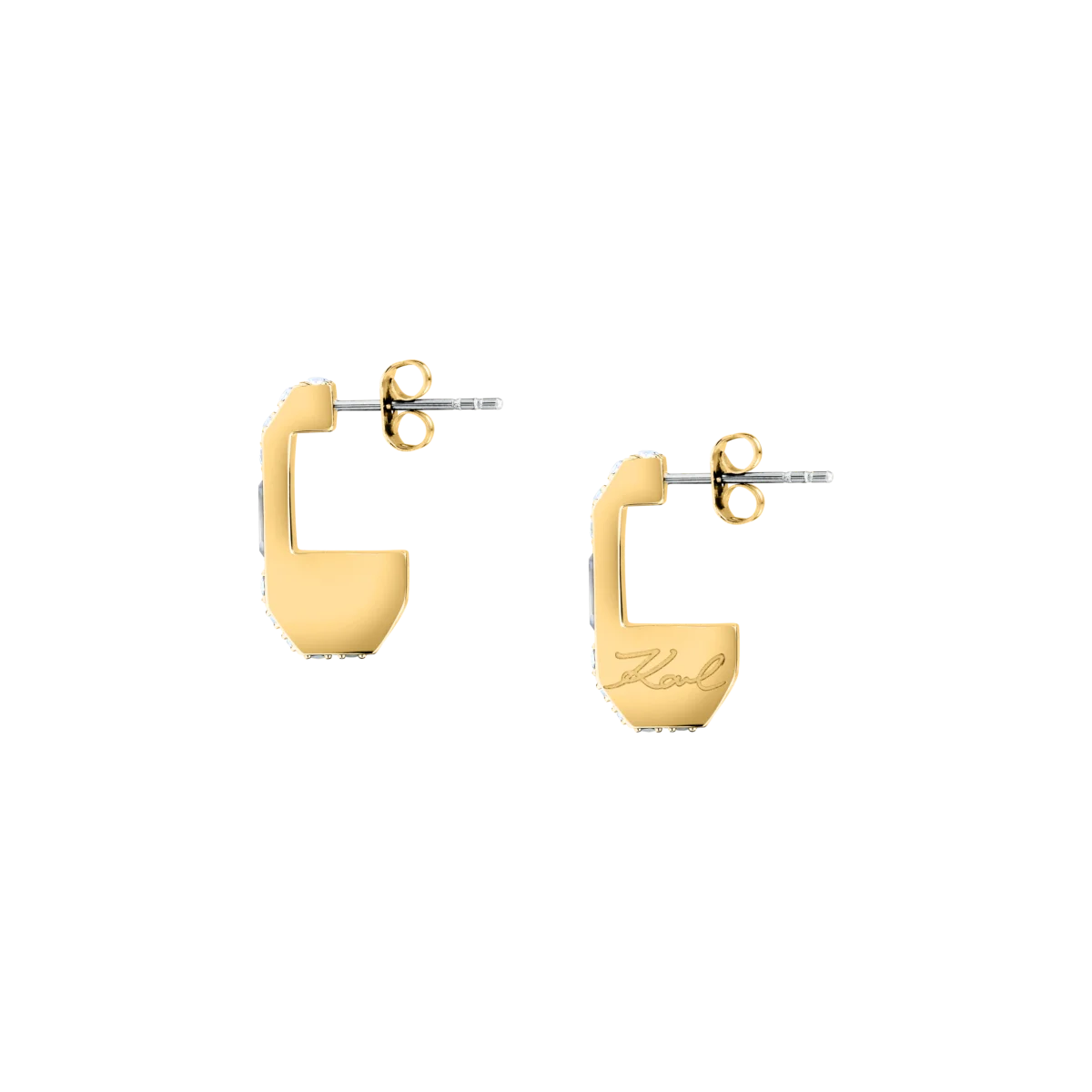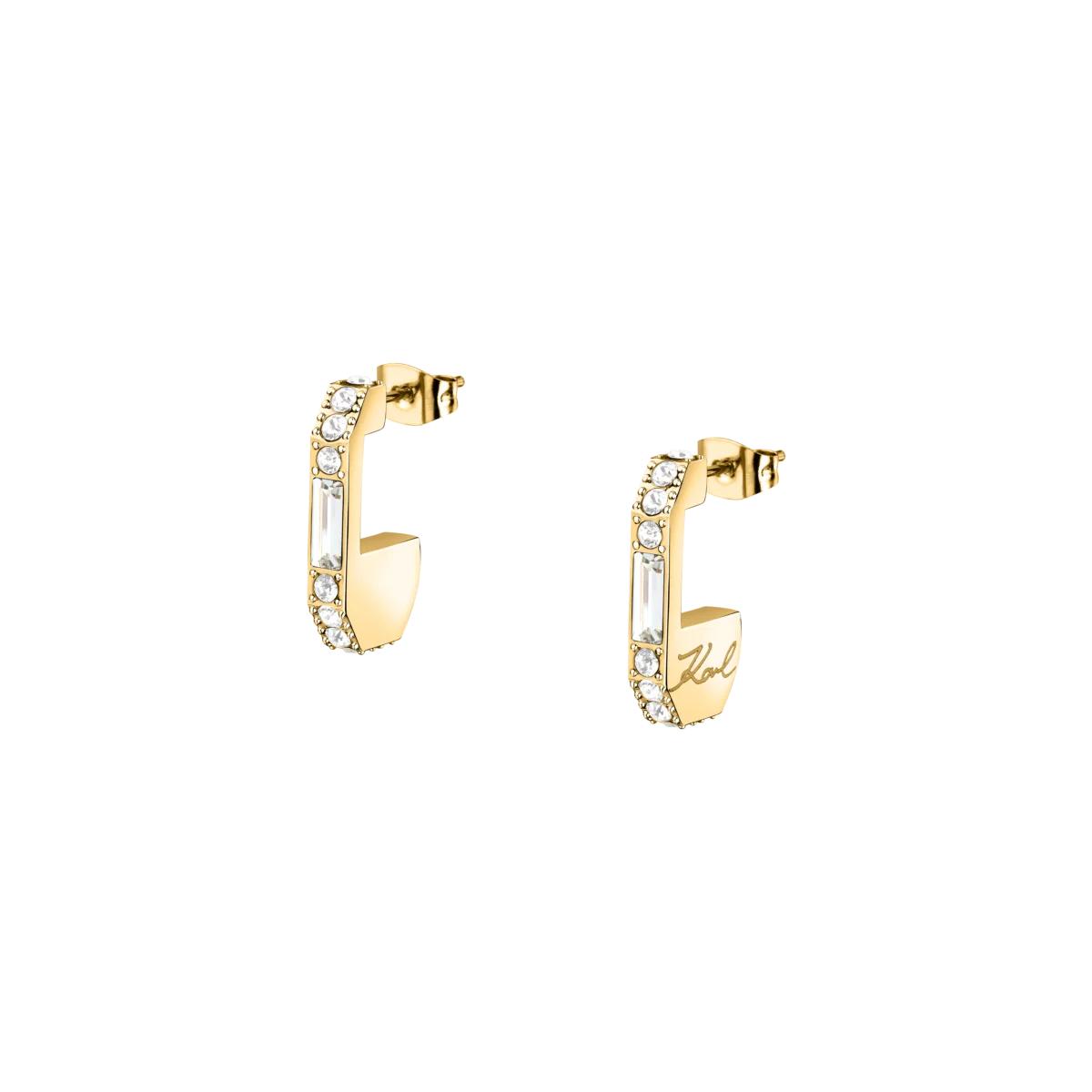 Обеци от колекция Crystals, изработени от неръждаема стомана 316L с PVD покритие в цвят жълто злато. Материалът е хипоалергенен и устойчив на потъмняване, а фината полировка подчертава луксозния характер на модела. Отстрани се вижда гравираният подпис Karl, който дискретно разкрива дизайнерския произход.