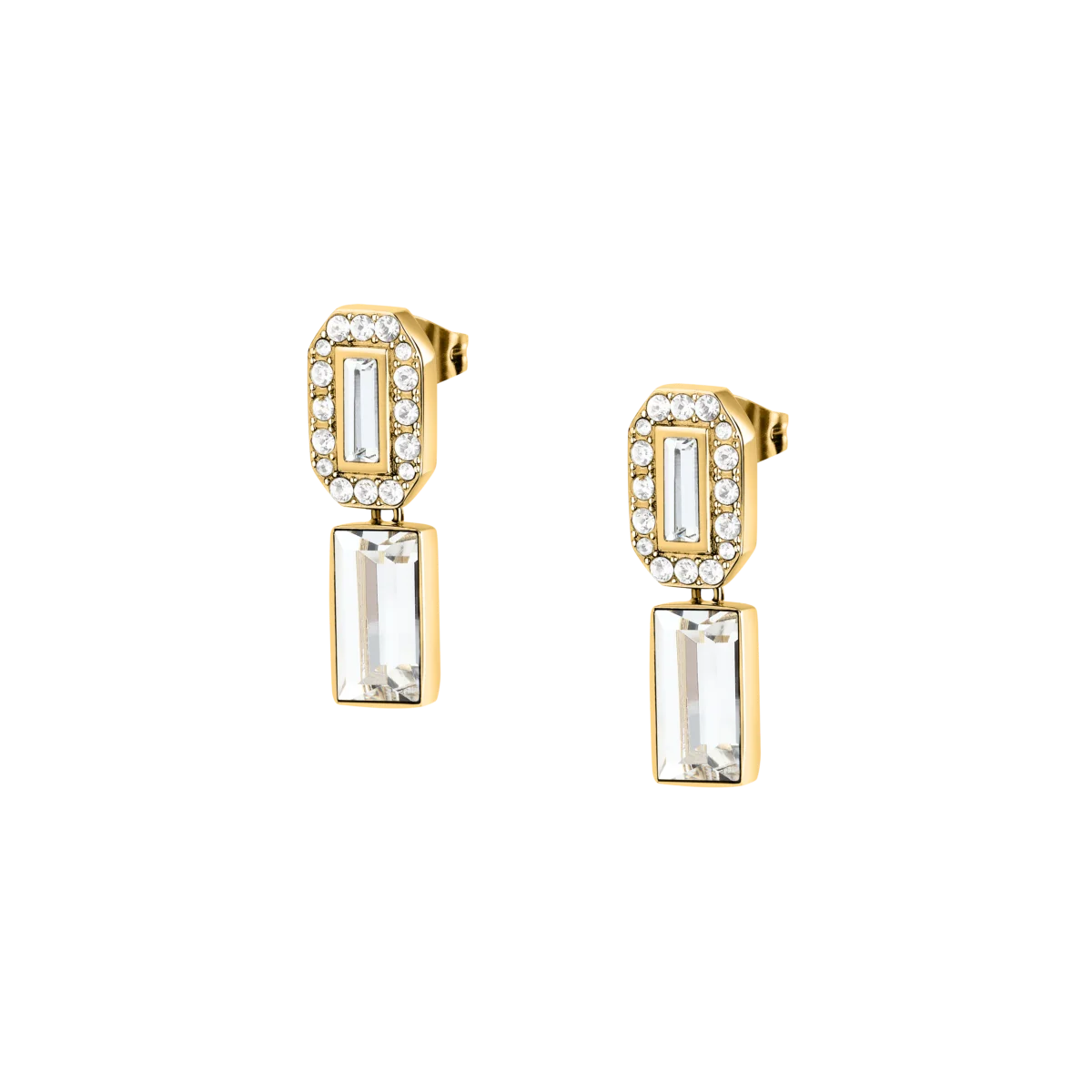 Обеци от колекция Crystals, изработени от неръждаема стомана 316L с PVD покритие в цвят жълто злато. Полираният метал подчертава чистия блясък на кристалите и осигурява издръжливост, устойчивост на потъмняване и комфорт при ежедневно носене. Дизайнът е едновременно модерен и класически – идеален както за офис визии, така и за вечерна рокля.
