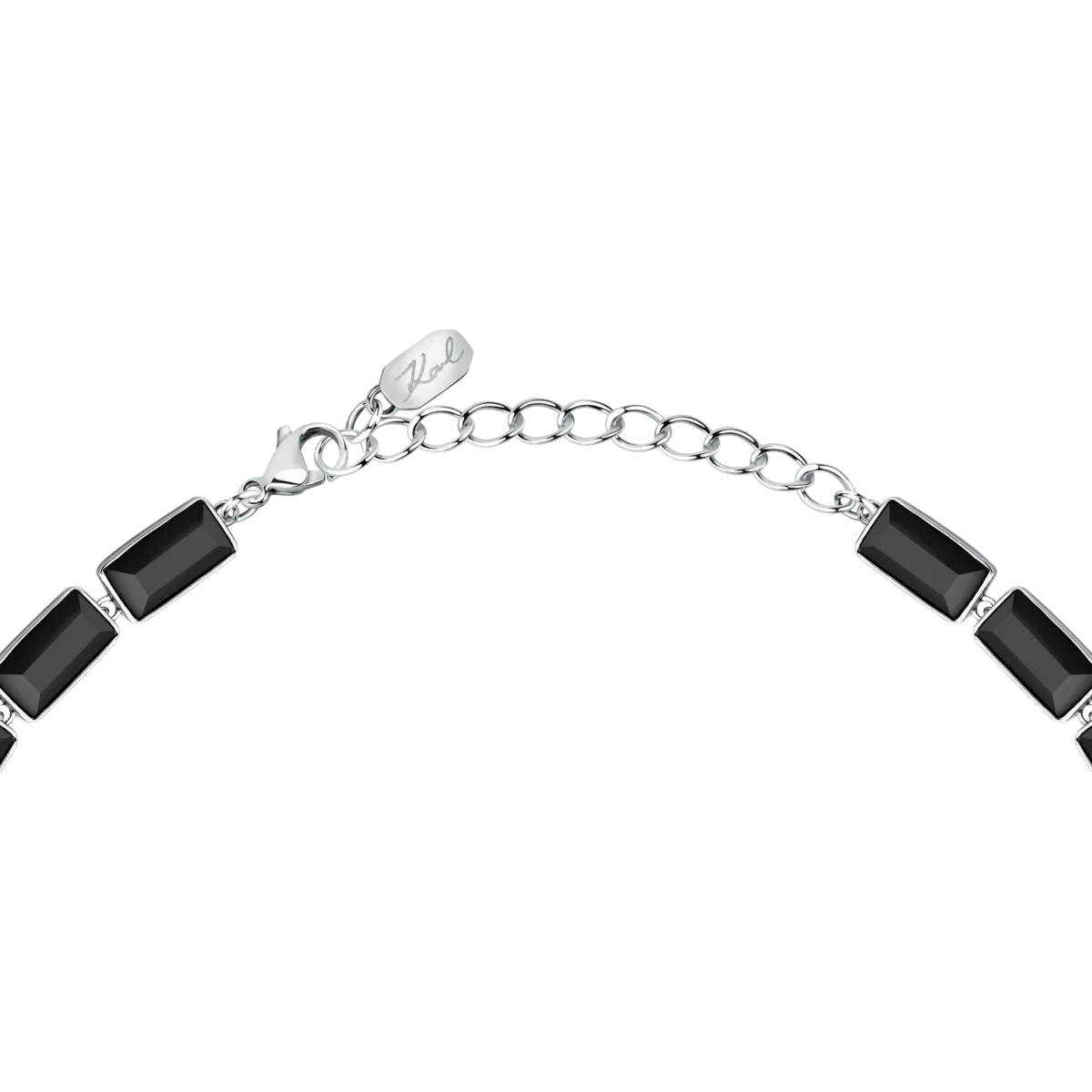 Верижката е изработена от висококачествена неръждаема стомана в сребрист цвят, устойчива на потъмняване и ежедневно носене. Всеки черен елемент е поставен в прецизно изработена рамка, а междинните звена с паве от бели кристали добавят още светлина. Един от елементите е оформен с характерния подпис „Karl“ – дискретен знак за дизайнерски произход.