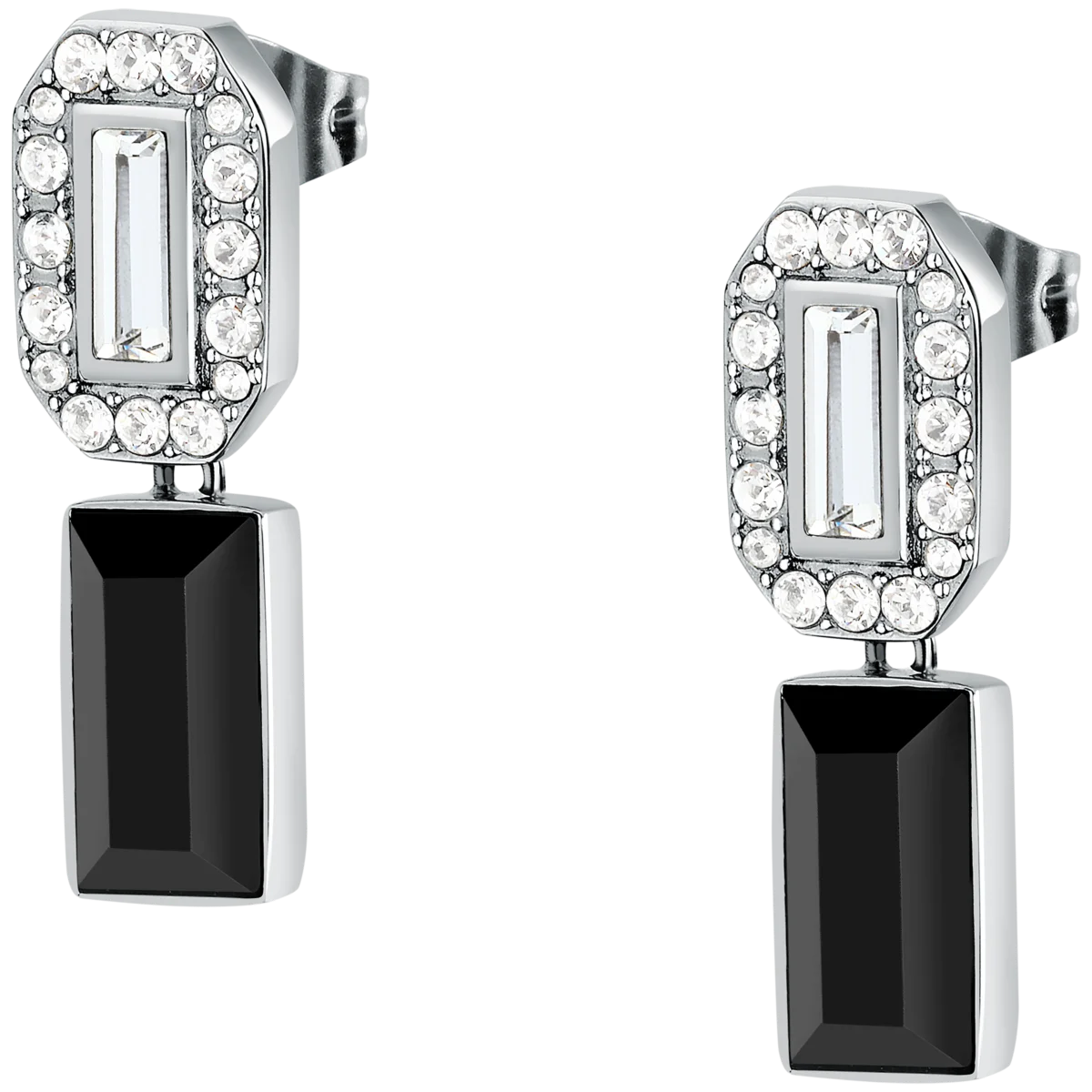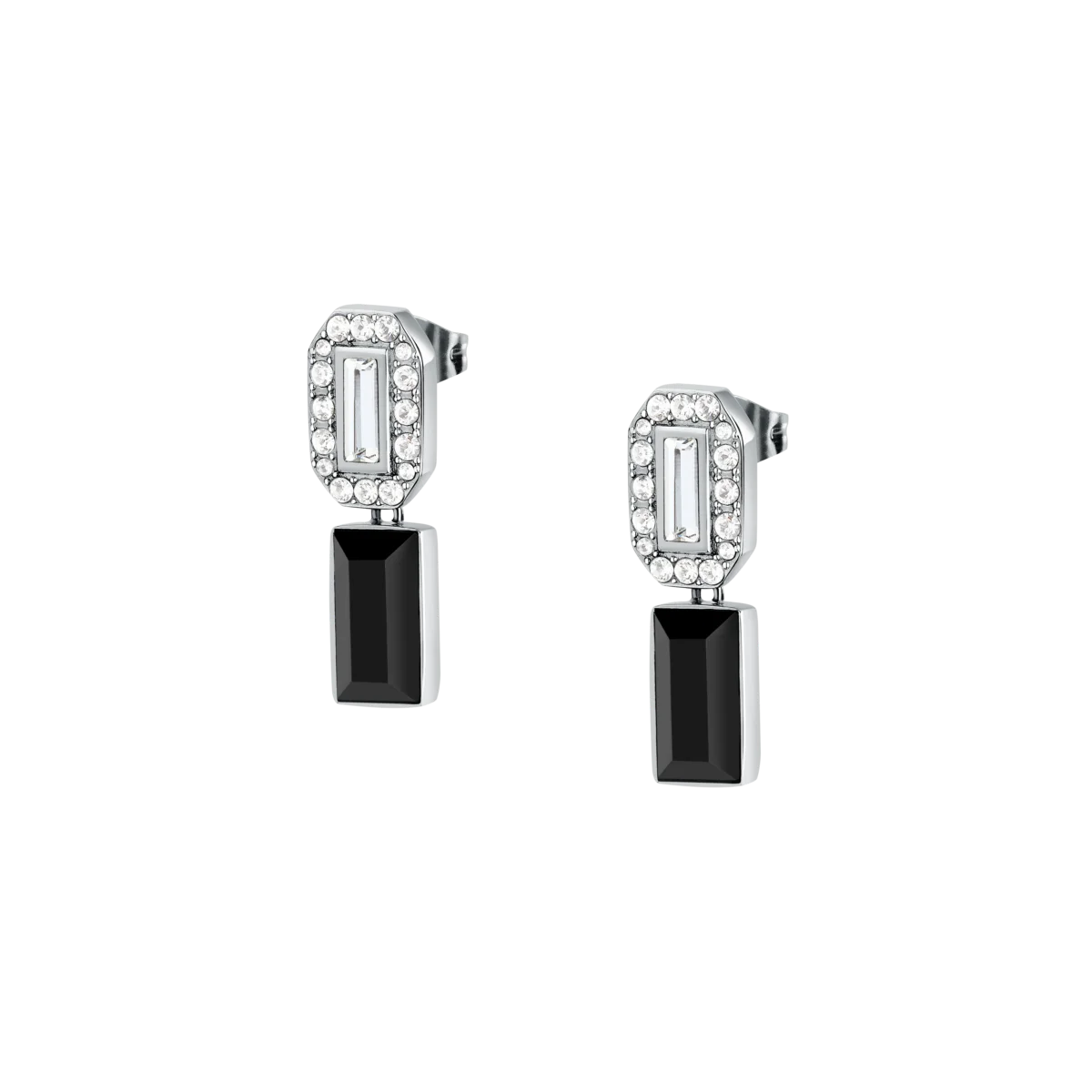 Дамските обеци Karl Lagerfeld Crystals KLAYC41 носят класическо холивудско излъчване в компактна форма. В горната част стои правоъгълен мотив с бели кристали тип паве и продълговат камък в центъра, а отдолу се спуска изчистен черен кристал с правоъгълен шлиф. Контрастът между черно и бяло прави модела идеален за вечерни поводи и елегантни офис визии.